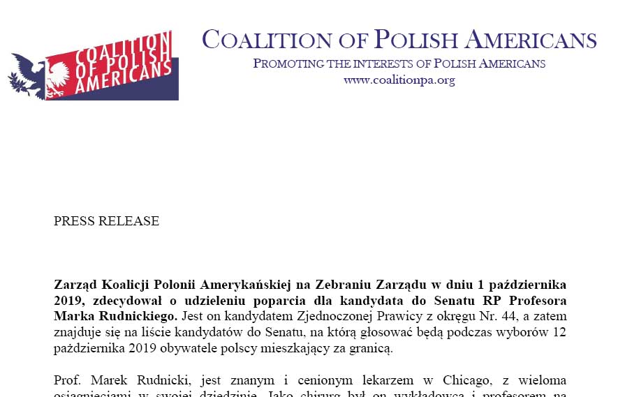Zarząd Koalicji Polonii Amerykańskiej na Zebraniu Zarządu w dniu 1 października 2019, zdecydował o udzieleniu poparcia dla kandydata do Senatu RP Profesora Marka Rudnickiego. Jest on kandydatem Zjednoczonej Prawicy z okręgu Nr. 44, a zatem znajduje się na liście kandydatów do Senatu, na którą głosować będą podczas wyborów 12 pażdziernika 2019 obywatele polscy mieszkający za granicą.
