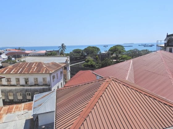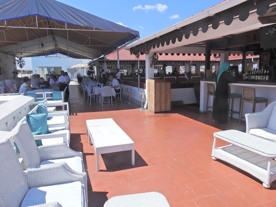 Dochodzimy do miejsca, gdzie zamiast drzwi jest winda. Wsiadamy do tej windy i wysiadamy na terenie obiektu, gdzie możemy się czegoś napić lub zjeść obiad, ale przy okazji zobaczyć Stone Town może nie z wysokości lotu ptaka, ale tuż nad dachami.