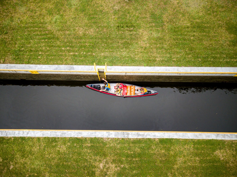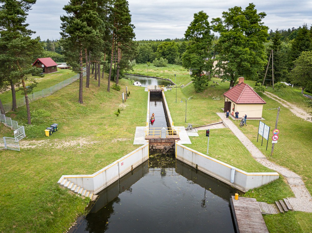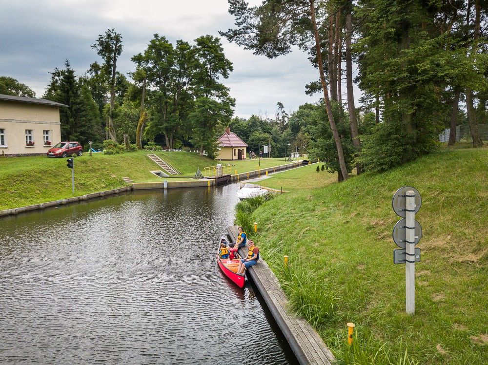 Wieczorem dopływamy do śluzy Zielonej i spędzamy wieczór przy ognisku z panami śluzowymi i ich rodzinami. Obsługa śluzy to tradycja rodzinna. Młody pan Tomek jest mniej więcej w naszym wieku i wykonuje ten sam zawód, co jego ojciec i wcześniej dziadek. Na szczęście ma dwóch synów, czyli jest szansa na kontynuowanie tradycji. Pan Tomek mieszka w domu po jednej stronie śluzy, jego rodzice – po drugiej. Ciekawe, że mogą przejść do siebie pieszo, ale przejechać samochodem już nie – dzieli ich kanał. Muszą jeździć na około do najbliższego mostu. Opowiadają, że kiedyś w soboty i niedziele mieli po 30 śluzowań dziennie, teraz jest ledwo 15. Przy okazji dowiadujemy się, dlaczego w tej okolicy nie ma komarów – zostały zjedzone przez nietoperze. Naturalne metody są jak widać najskuteczniejsze.
