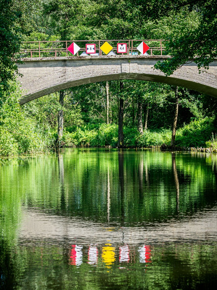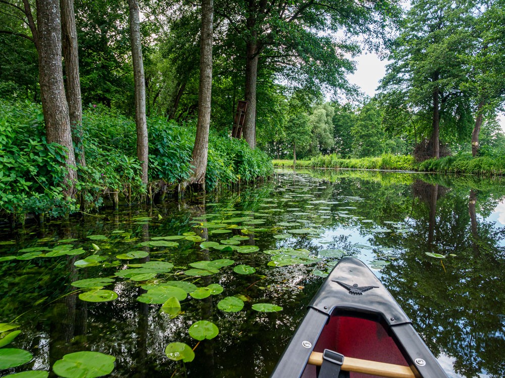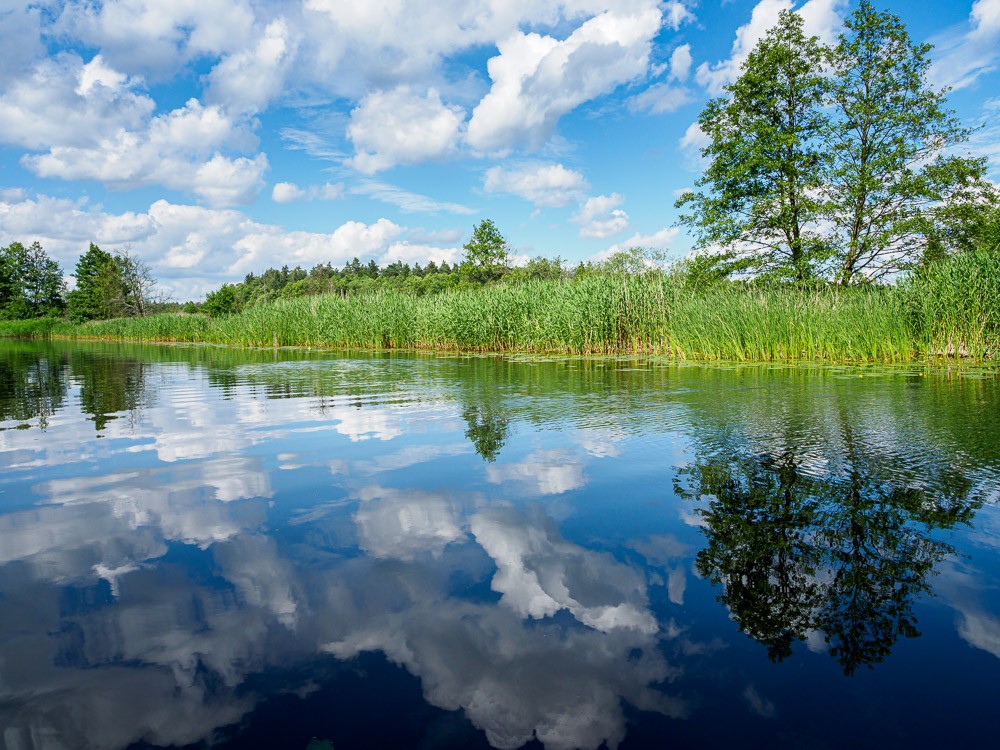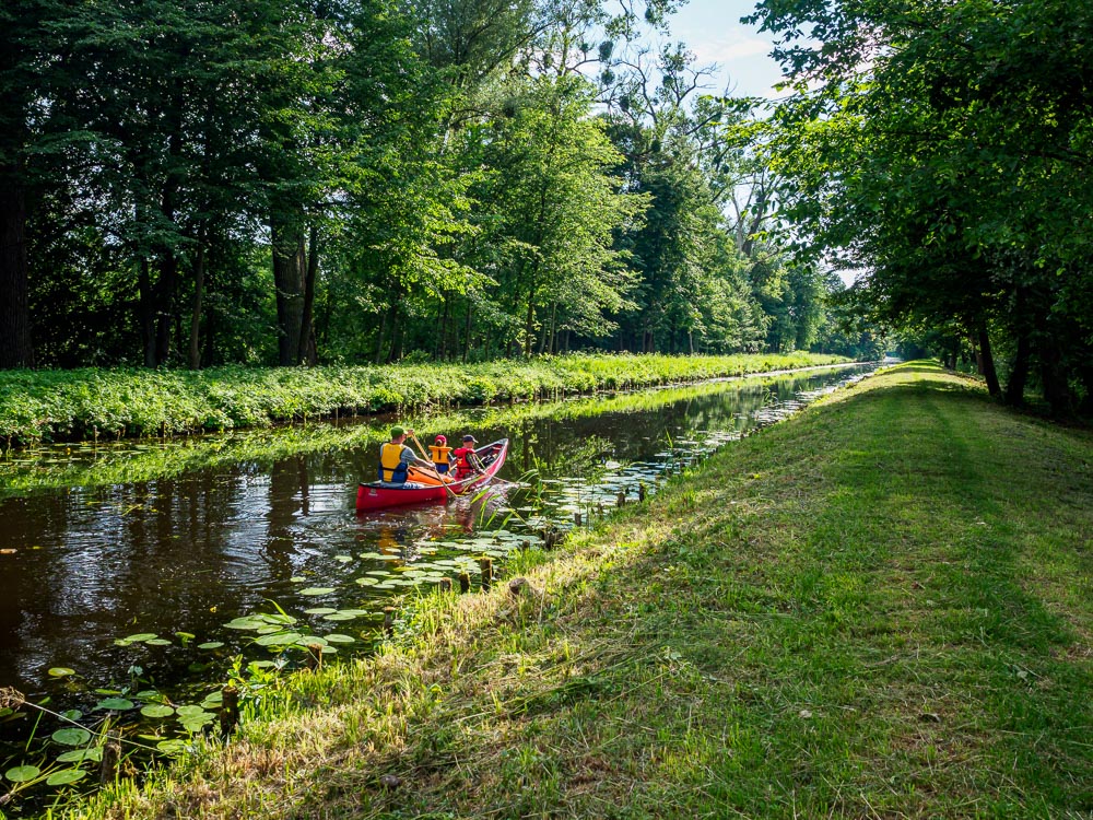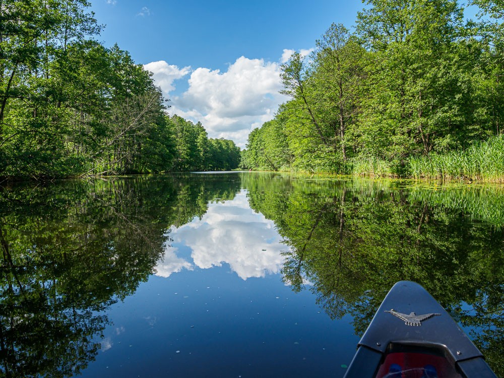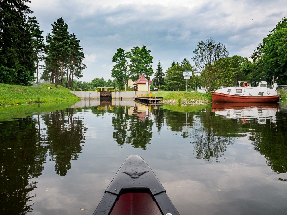 Warunki w kanale w porównaniu z jeziorem Drwęckim są wprost luksusowe. Zero wiatru, suniemy sobie po gładkiej tafli wody. Drzewa rosnące nad brzegami dają miły cień i odbijają się w wodzie jak w lustrze. Ruchu praktycznie nie ma, mija nas tylko jeden kajak. Jest też późno, dlatego od początku szukamy miejsca na nocleg.