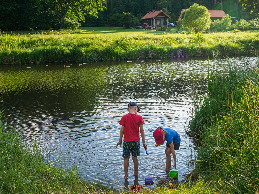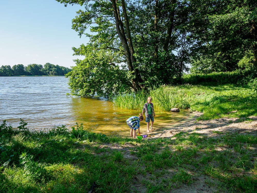 Za Miłomłynem jest trochę mniej dziko niż wcześniej. Częściej widać cywilizację. Kanał ma też więcej prostych odcinków. Nie oznacza to jednak, że łatwiej znaleźć przyjemne zejście na ląd. Jest późne popołudnie, a my nie mamy upatrzonego konkretnego miejsca na spanie. Po prostu płyniemy. Przyglądamy się zimorodkom, które polują na rybki. Pokazuję dzieciakom małą pijawkę na liściu jakiejś wodnej rośliny. Opowiadam oczywiście, że takie zwierzątko może mieć zastosowanie w medycynie.