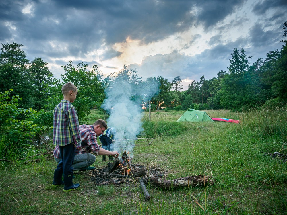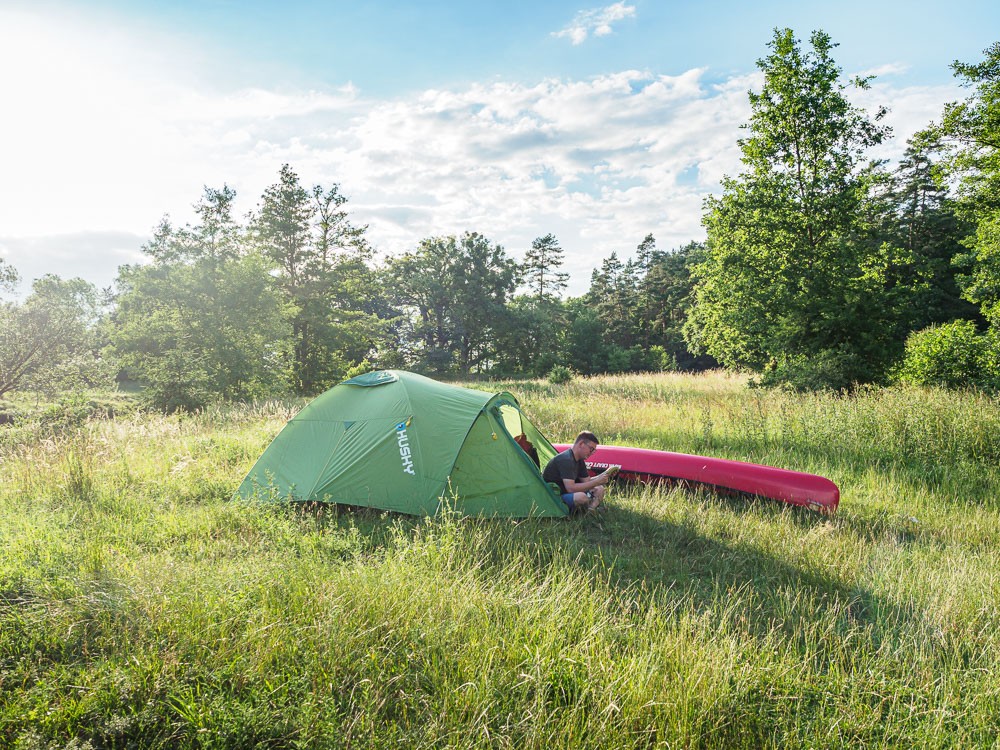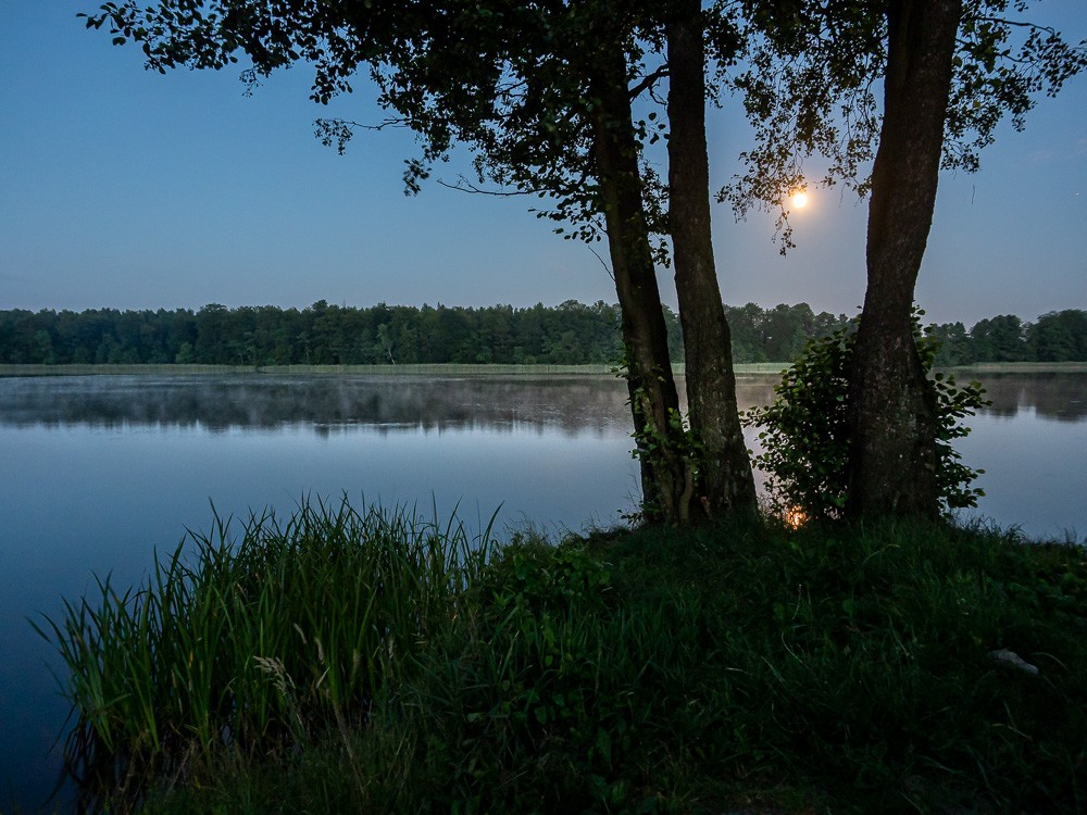 Nocleg przy kanale nie jest łatwą sprawą. Kanał to nie rzeka, nie ma płycizn przy brzegu i przyjemnych zejść do wody. Brzegi są wzmocnione palikami, a czasem nawet betonowymi słupkami i płytami. Niewiele jest miejsc, w których komfortowo można zejść na brzeg, a takich, gdzie by się jeszcze znalazł kawałek równego terenu na namiot, to już w ogóle ze świecą szukać. Wreszcie jednak pojawia się dogodne miejsce z tabliczką „punkt czerpania wody”. Jest nawet miejsce po ognisku i wygnieciona trawa po czyimś namiocie. Słońce pięknie zachodzi, a wieczorem wokół nas latają świetliki.