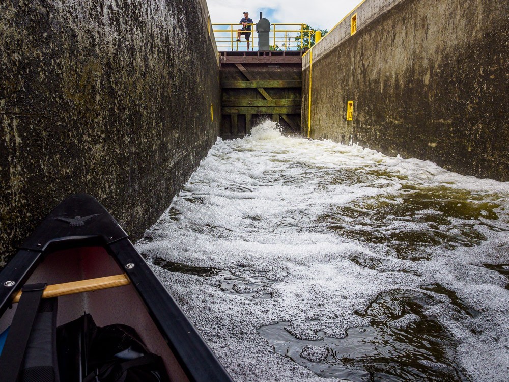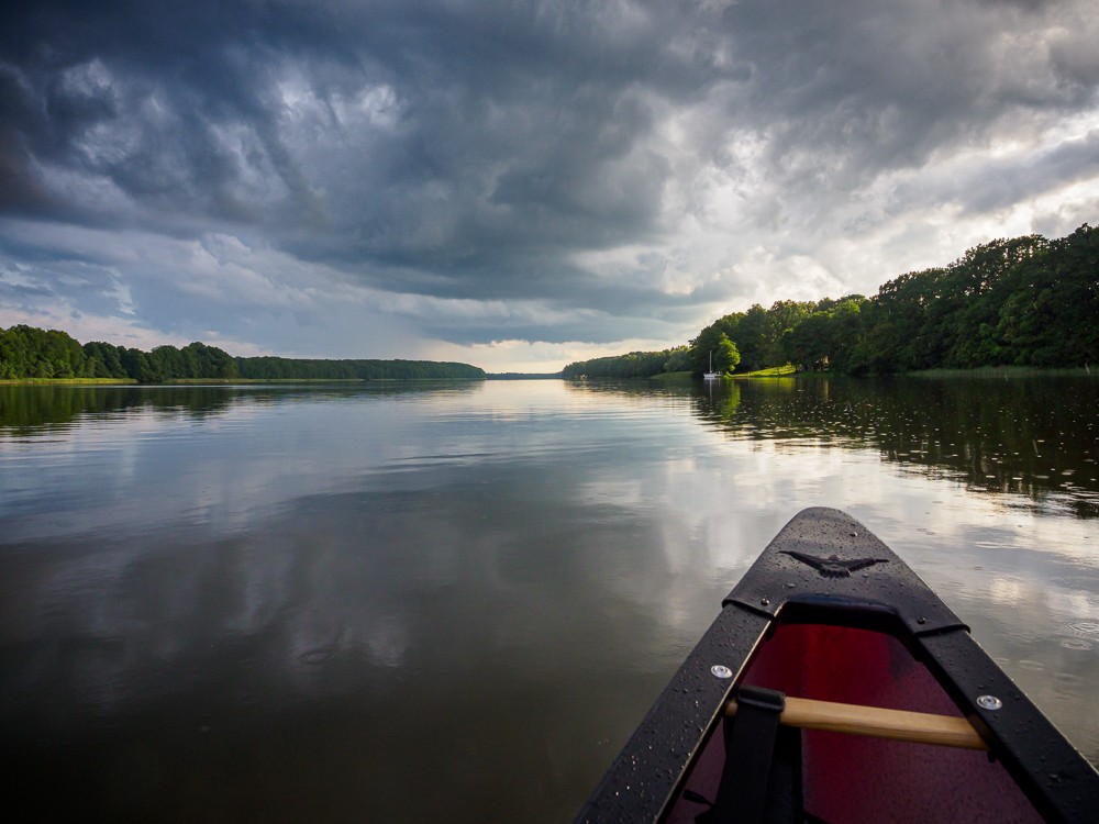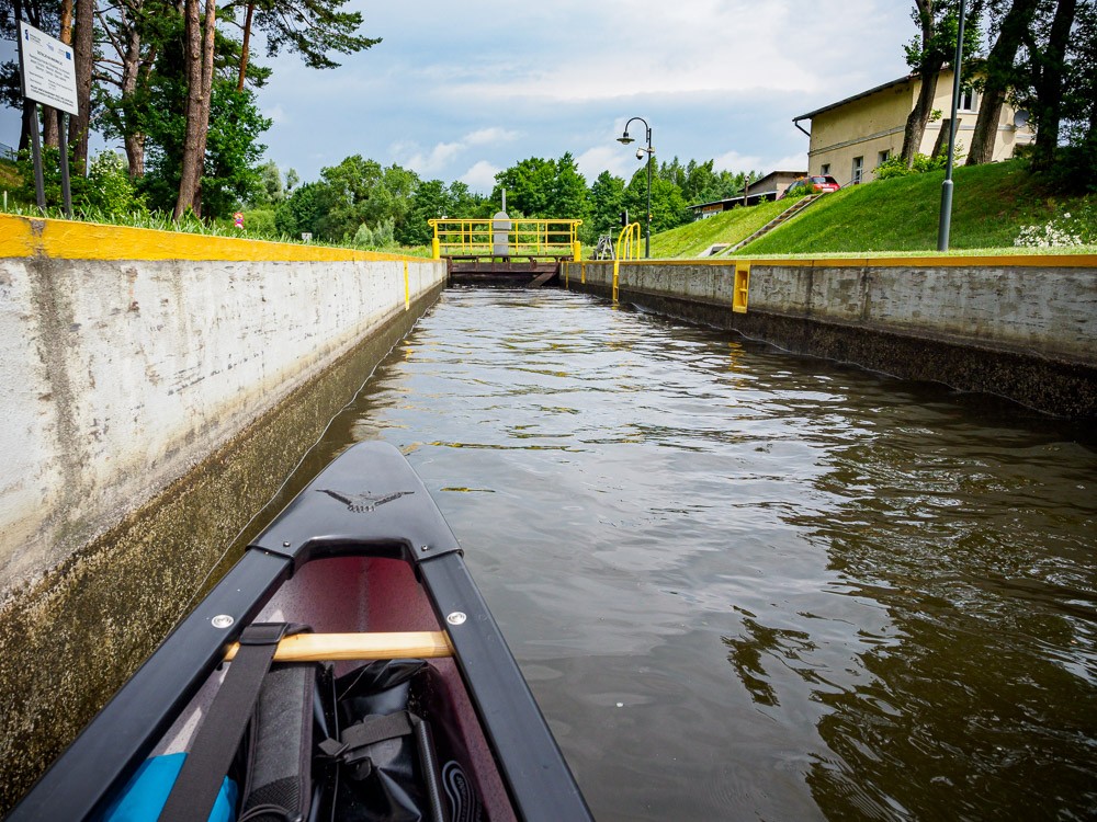 Dojeżdżamy więc do Ostródy, gdzie wodujemy się na jeziorze Drwęckim. Jesteśmy wyjątkowo elegancko zapakowani, jak nigdy – żadnych siatek, reklamówek itp. Najpierw mamy do pokonania odcinek przez jezioro. Oczywiście wieje w twarz, jakże by inaczej. Oswajamy się z naszym canoe i szukamy wejścia do kanału.