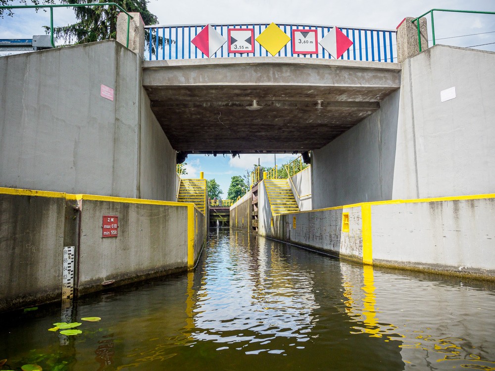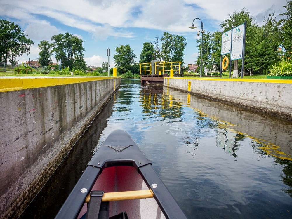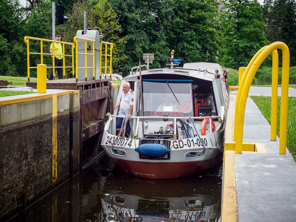 Postój mamy w miejscowości Miłomłyn, gdzie przeprawiamy się przez śluzę o różnicy poziomów 2,8 metra. Budzi respekt. Za śluzą kanał Elbląski się rozdziela. W prawo do Elbląga, w lewo do Iławy. My skręcamy w lewo.