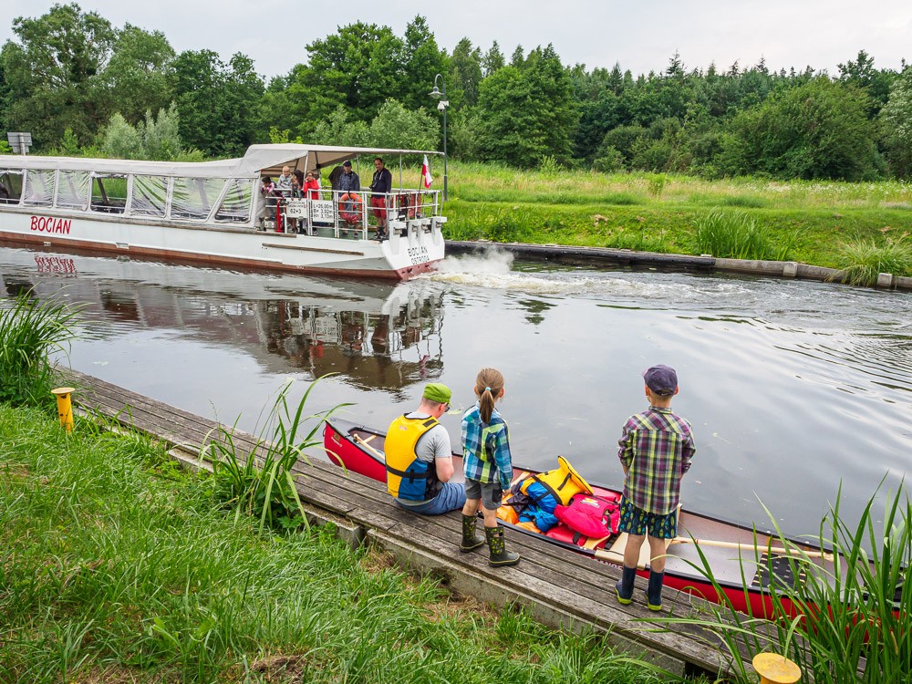 A następnego ranka wieje niemiłosiernie. Rezygnujemy z Jezioraka. „To ma być przyjemność, a nie katorga”, mówi mój mąż. Więc wracamy tak samo, jak płynęliśmy w tą stronę. Marzą nam się lody w Miłomłynie i nocleg w domku turystycznym pana śluzowego z Zielonej. Jest sobota i ruch na kanale większy. Z pewnym smutkiem obserwuję, że łajb napędzanych siłą mięśni poza naszą brak. Żaglówek też mało, przeważają motorówki. Większe i mniejsze, niektóre nawet całkiem luksusowe. Są warczące skutery wodne z fontanną z tyłu. O nas ludzie najwyraźniej nie wiedzą, co myśleć. Na statku wycieczkowym dzieciaki spierają się, czy to kajak, czy może łódka. Gdzieś na brzegu pani się dziwi, co to za duży czteroosobowy kajak, bo jeszcze takiego nie widziała.