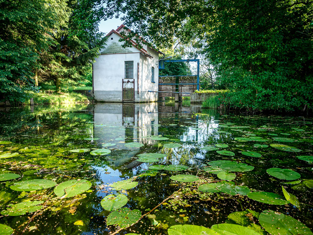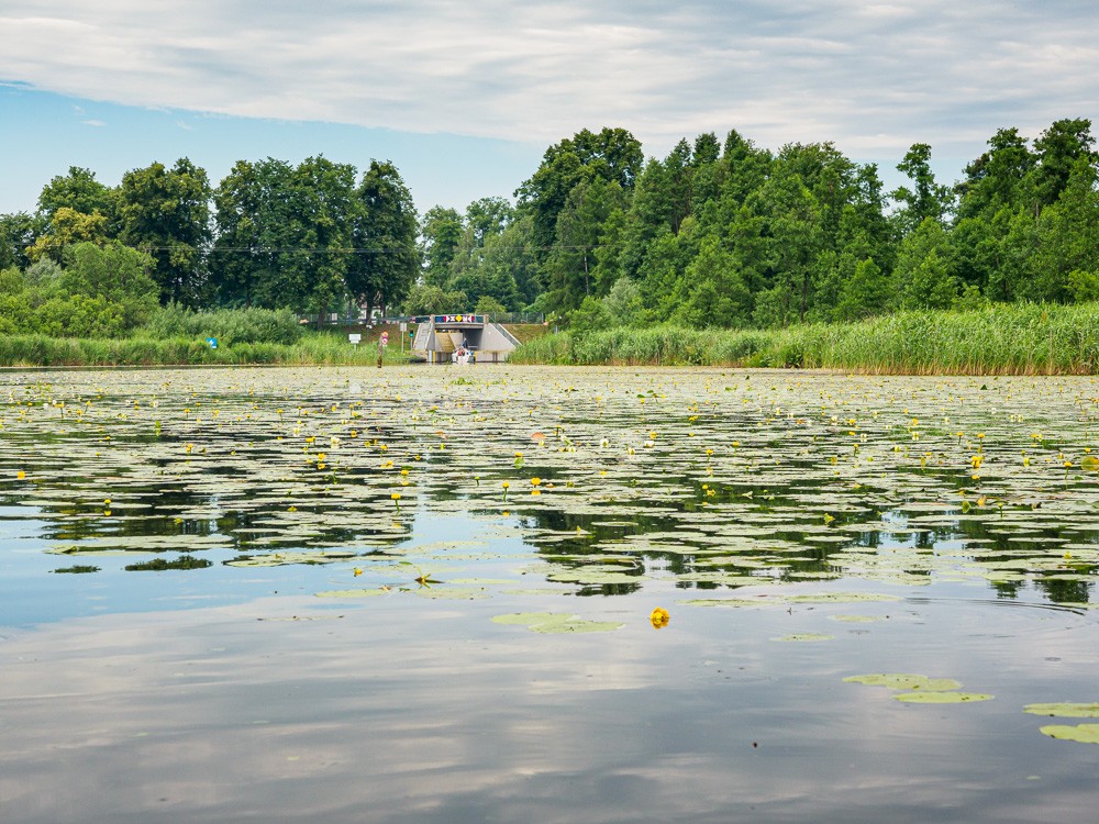 Drugi dzień rozpoczynamy od przepłynięcia przez śluzę Zieloną. Pan śluzowy mówi nam o możliwości skorzystania z noclegu w domku turystycznym znajdującym się na jego posesji. Tego dnia jednak płyniemy dalej. Chmurzy się, spadają pierwsze krople. Chowamy się przed deszczem pod zielonym parasolem drzew. Na szczęście deszcz szybko przechodzi. Możemy ruszać. Podziwiamy roślinność – grążele żółte i grzybienie białe, czyli nenufary. Nie spodziewałam się, że zobaczę tutaj takie kwiaty i w takiej ilości.