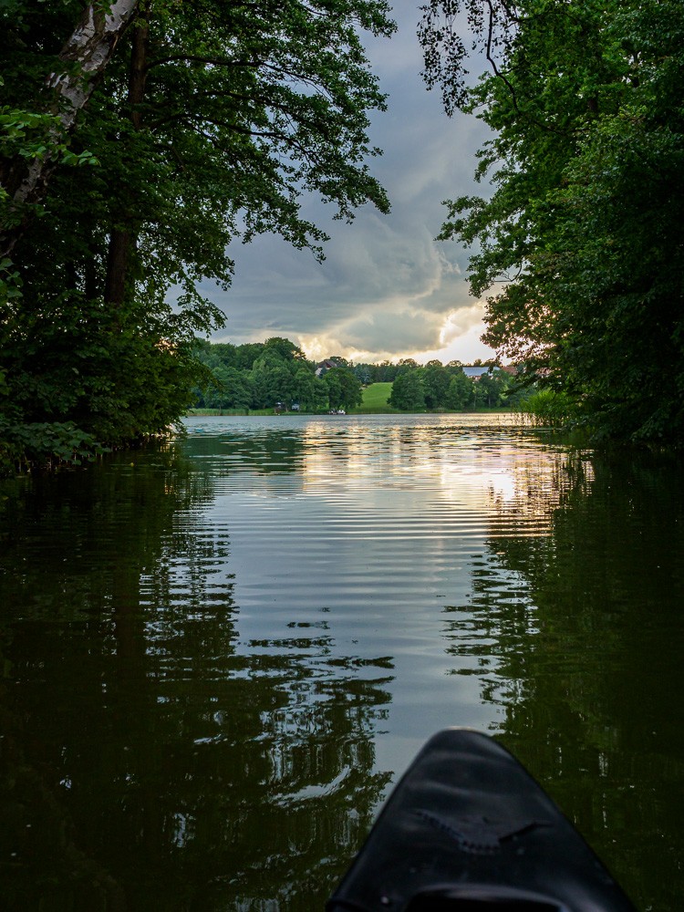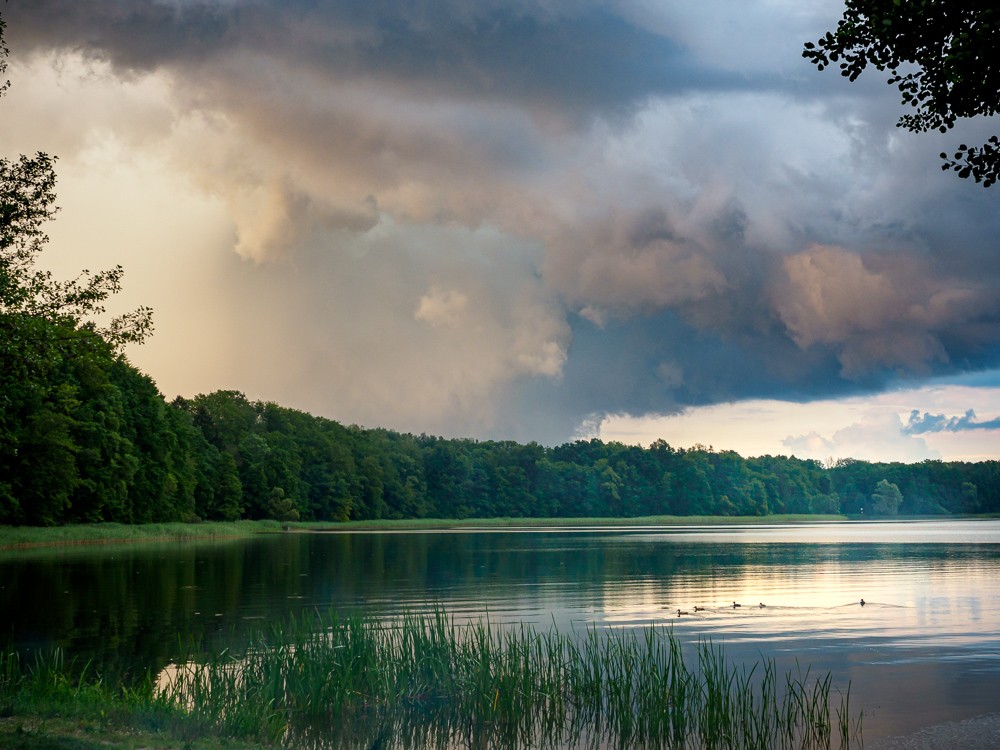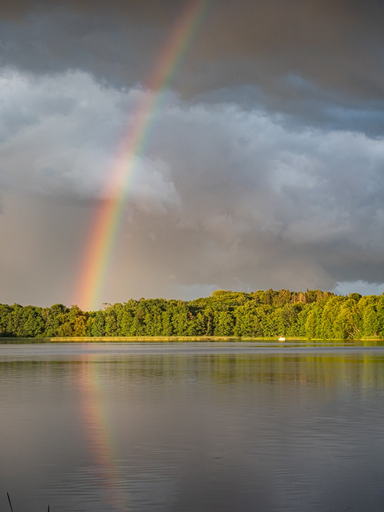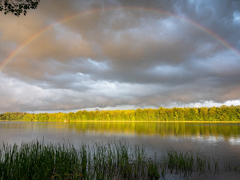 Kanał w końcu doprowadza nas do jeziora Dauby, a po krótkim przewężeniu wpływamy na Jeziorak. Jest wieczór, chmury wyglądają dość złowrogo. Na nocleg wybieramy pierwsze nadające się do tego miejsce – jakieś gminne miejsce do kąpieli. Wypakowujemy wszystko na brzeg i uwalniamy żabę. Gdy kończymy rozbijać namiot, spadają pierwsze krople deszczu. Ale długo nie pada. Za to potem pojawia się wspaniała tęcza.