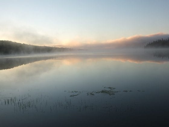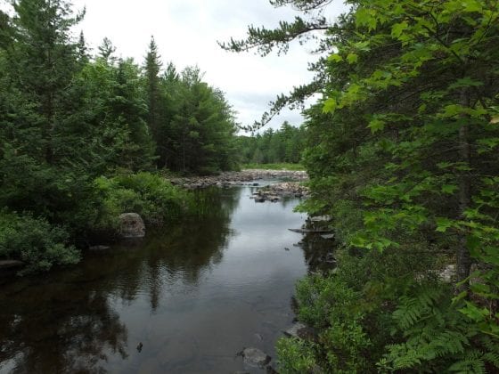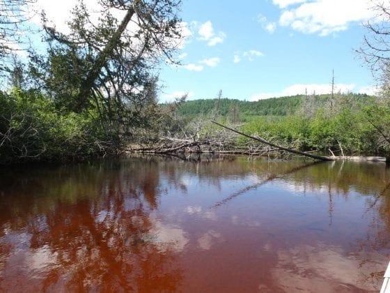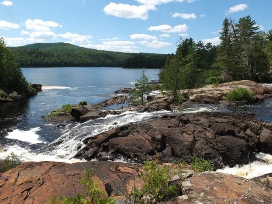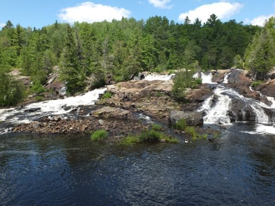 Niespodzianka czekała nas także na szlaku do wodospadów Wilkie, teoretycznie dostępnych pieszo i canoe, o czym informuje parkowa mapka tras. Wypożyczyliśmy w parku canoe ze startem na Flack Lake. Aluminiowa pogięta łajba była własnością Ministerstwa Zasobów Naturalnych Ontario z jego logo, co wystraszyło jedyne dwie motorówki wędkarzy na olbrzymim jeziorze. Po przepłynięciu Flack Lake okazało się, że przenoska 160 metrów przy Laurentian Lodge od kilku lat nie istnieje, trasa jest zlikwidowana, piesza także, bo most jest zwalony, ale urodziwa i wielce życzliwa właścicielka zamkniętego z powodu koronawirusa ośrodka pozwoliła nam przenieść canoe przez jej teren. Obejrzeliśmy dzięki temu przepiękny wodospad, zeszpecony niestety z jednej strony przez budynek minielektrowni wodnej, i wpłynęliśmy kilkaset metrów w górę Boland River należącej do parku, z przedziwnie czerwoną wodą. Dalej nie dało się sforsować rzeki, zatarasowanej powalonymi drzewami, chociaż Boland na wielu mapach nadal jest opisywana jako spławna trasa canoe.