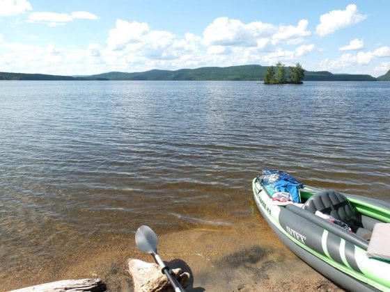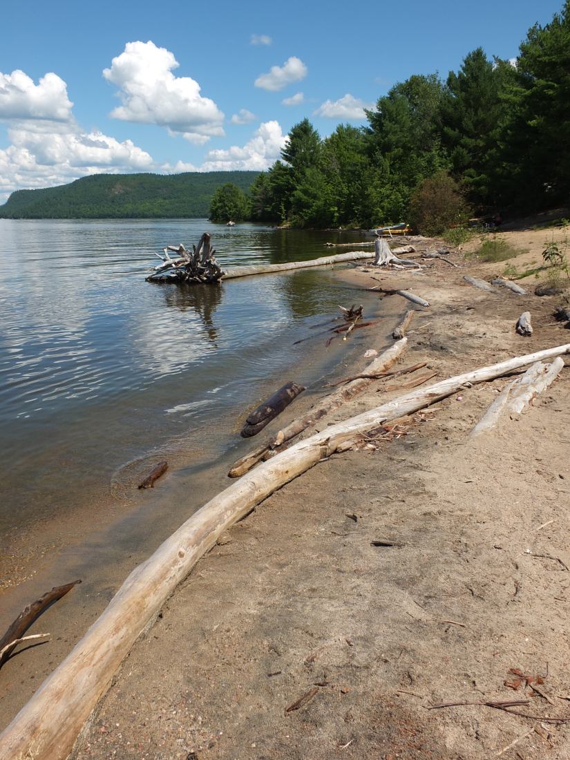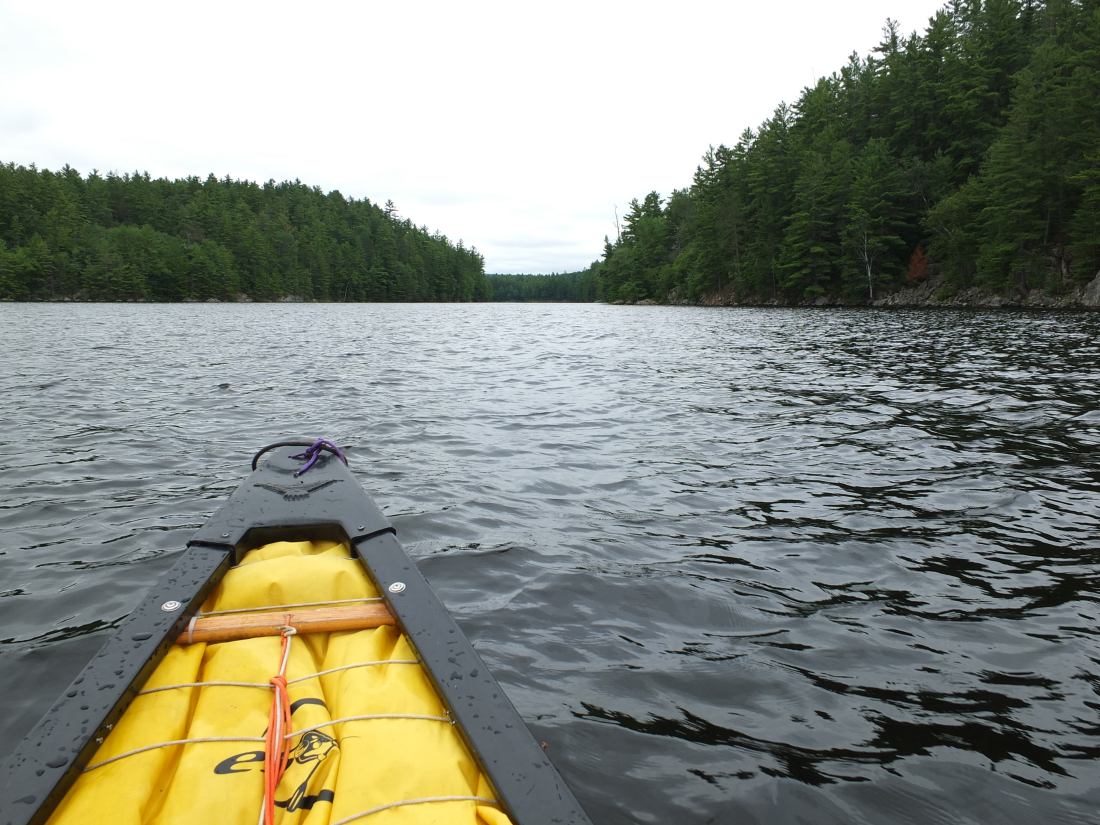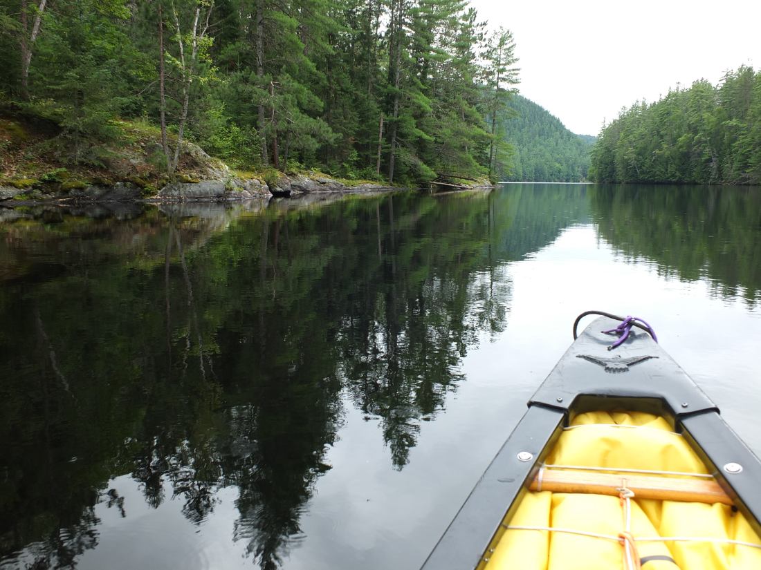 Przyjechaliśmy do parku w sobotę po drugiej po południu, kiedy zwolniło się miejsce. Pogoda piękna, woda cieplutka, pływaliśmy z widokiem na Laurentyny, nadmuchaliśmy kajak i spenetrowaliśmy zatokę. Kajak stał się po tej wycieczce bezużyteczny z powodu dziury. Następnego dnia miało lać. Liczyliśmy, że jak często się to zdarza, prognoza Environment Canada będzie nietrafna. Niestety, oberwanie chmury trwało przez cały dzień. W biurze chcieliśmy zamówić canoe na poniedziałek, okazało się, że z powodu koronawirusa canoe nie wypożyczają. Na stronach Ontario Parks jest informacja, że trzeba mieć własne kamizelki ratunkowe, takie mamy, jak też własne wiosła, bardziej na północ nie mieliśmy tydzień wcześniej żadnych problemów. Widać jest jakaś magiczna linia w Ontario, poniżej której canoe nie można wypożyczyć. Jeździliśmy po okolicznych ośrodkach, ale łodzie mieli tylko dla własnych klientów. Zrezygnowani spoglądaliśmy na ciemniejszą plamę gór na horyzoncie, ujście Dumoine, cel naszej wycieczki.