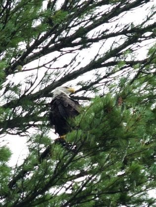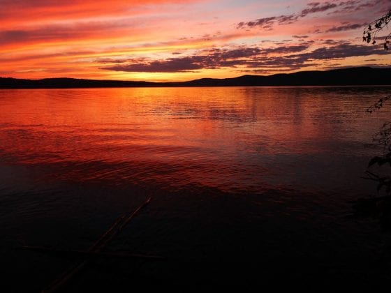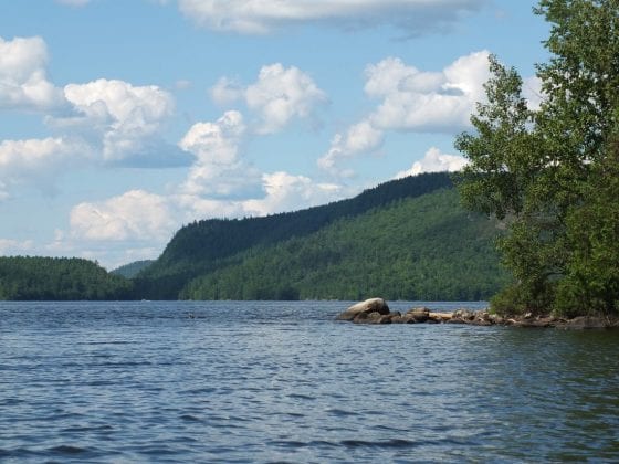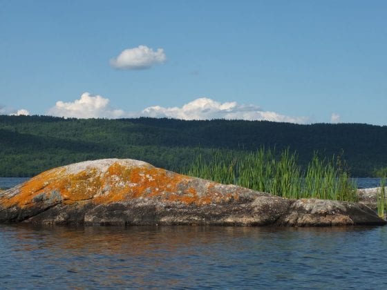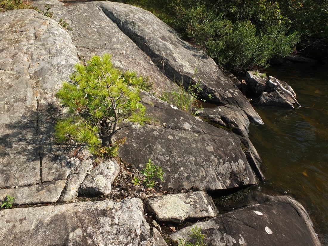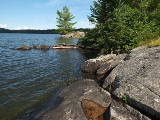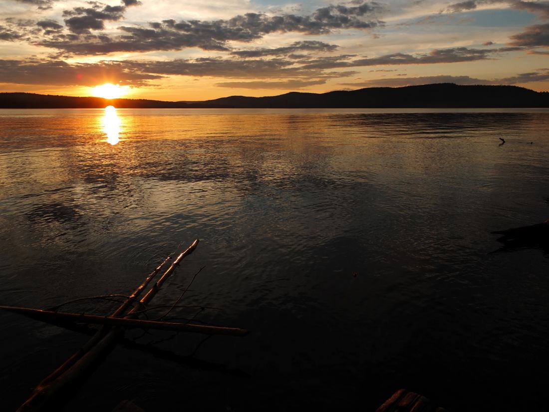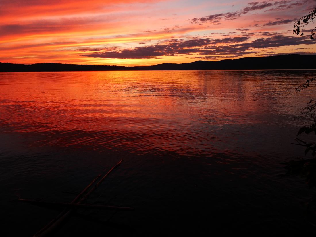 Przyjechaliśmy do parku w sobotę po drugiej po południu, kiedy zwolniło się miejsce. Pogoda piękna, woda cieplutka, pływaliśmy z widokiem na Laurentyny, nadmuchaliśmy kajak i spenetrowaliśmy zatokę. Kajak stał się po tej wycieczce bezużyteczny z powodu dziury. Następnego dnia miało lać. Liczyliśmy, że jak często się to zdarza, prognoza Environment Canada będzie nietrafna. Niestety, oberwanie chmury trwało przez cały dzień. W biurze chcieliśmy zamówić canoe na poniedziałek, okazało się, że z powodu koronawirusa canoe nie wypożyczają. Na stronach Ontario Parks jest informacja, że trzeba mieć własne kamizelki ratunkowe, takie mamy, jak też własne wiosła, bardziej na północ nie mieliśmy tydzień wcześniej żadnych problemów. Widać jest jakaś magiczna linia w Ontario, poniżej której canoe nie można wypożyczyć. Jeździliśmy po okolicznych ośrodkach, ale łodzie mieli tylko dla własnych klientów. Zrezygnowani spoglądaliśmy na ciemniejszą plamę gór na horyzoncie, ujście Dumoine, cel naszej wycieczki.