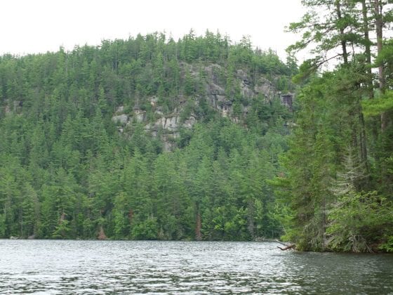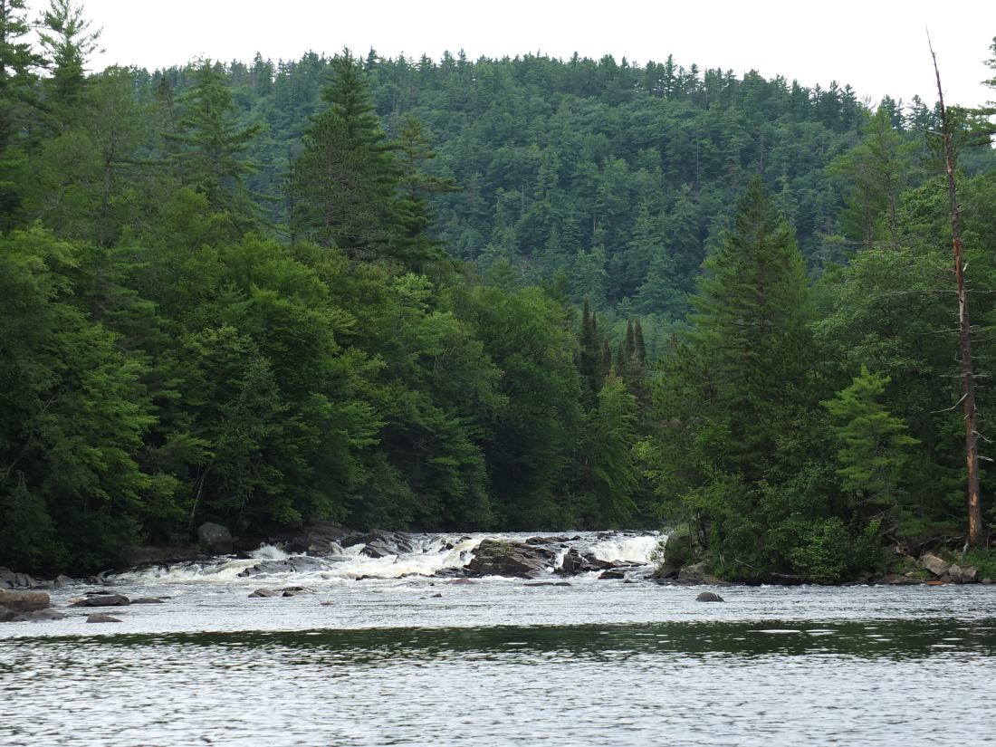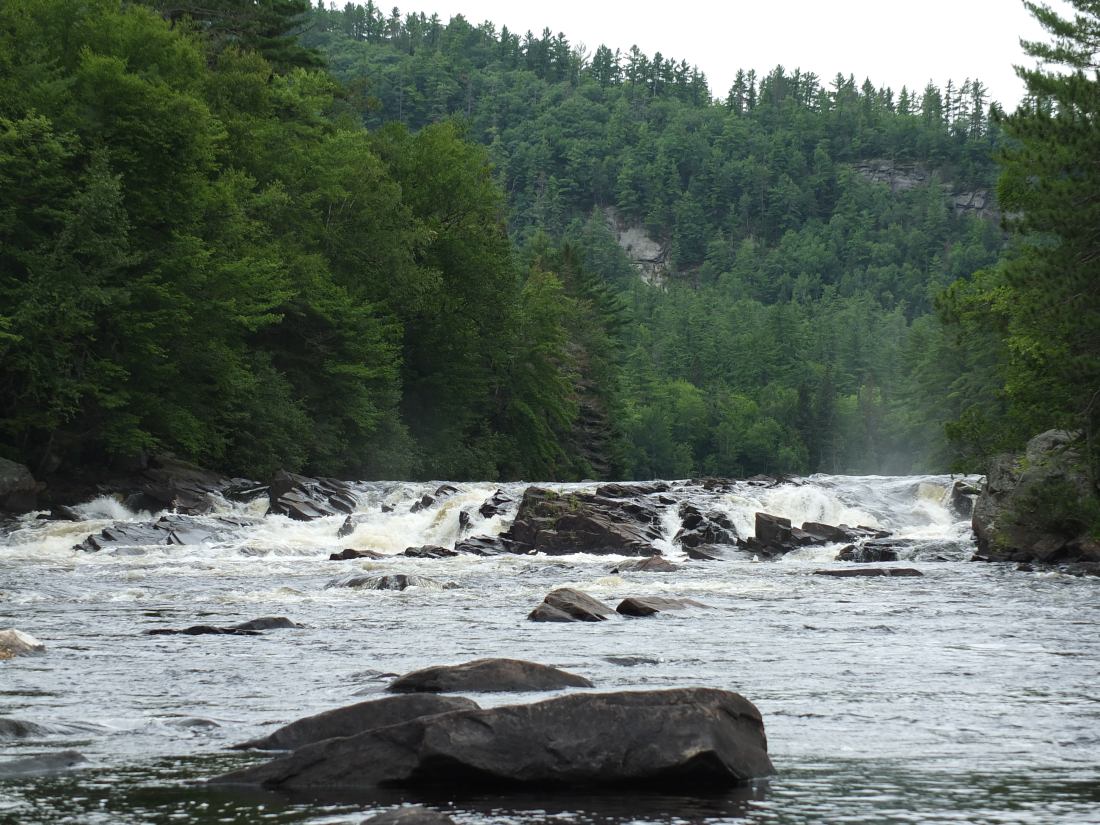 Od ujścia do pierwszych wodospadów, gdzie zdołaliśmy dotrzeć, kilkanaście kilometrów w tę i z powrotem w kilka godzin, nurt Dumoine jest ledwie wyczuwalny. Rzeka rozlewa się w niewielkie jeziora z wysepkami otoczone pionowymi klifami gór. Dopiero przed wodospadami czuć, że to rzeka właśnie. Nie mieliśmy niestety zbyt wiele czasu na robienie zdjęć, ale warto było tu przypłynąć. Latały nad nami orły, było dziko, cicho i pięknie.