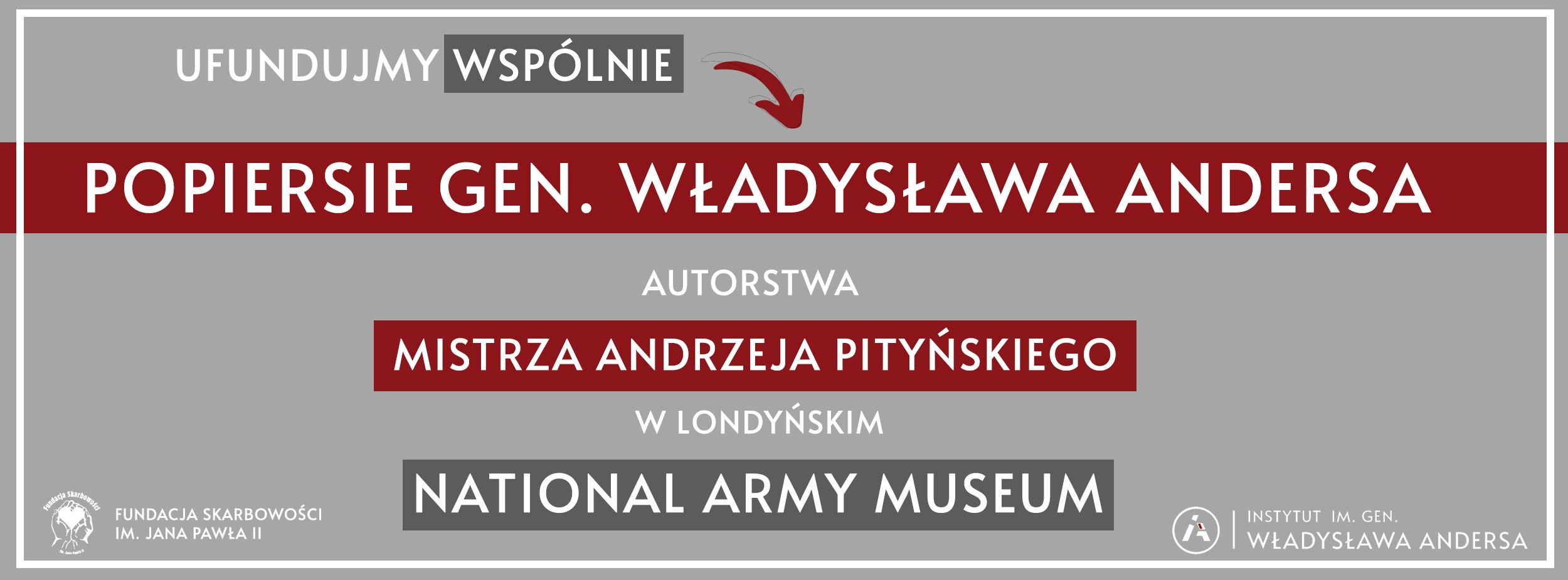 Instytut im. gen. Władysława Andersa oraz Fundacja Skarbowości im. Jana Pawła II ogłaszają niezwykłą inicjatywę, mającą na celu uhonorowanie postaci gen. Władysława Andersa w 50. rocznicę jego śmierci, która przypada na rok 2020. Pragniemy wspólnymi siłami naszych Rodaków w kraju i za granicą ufundować popiersie gen. Andersa, które zostanie przekazane na stałą ekspozycję do National Army Museum w Londynie.