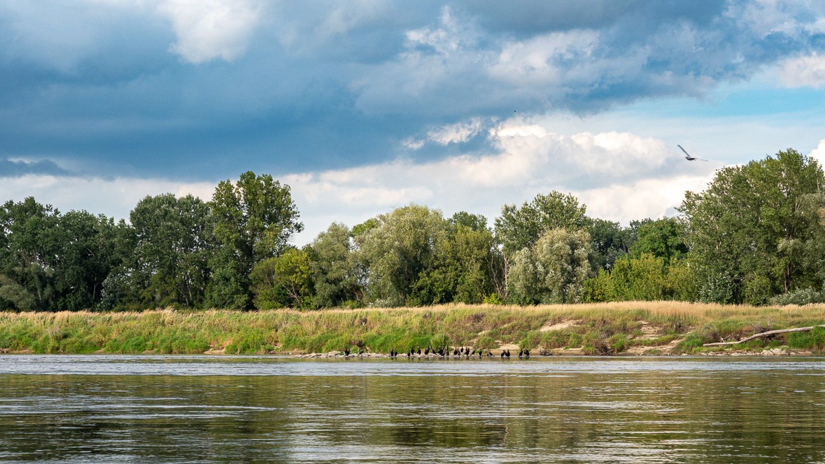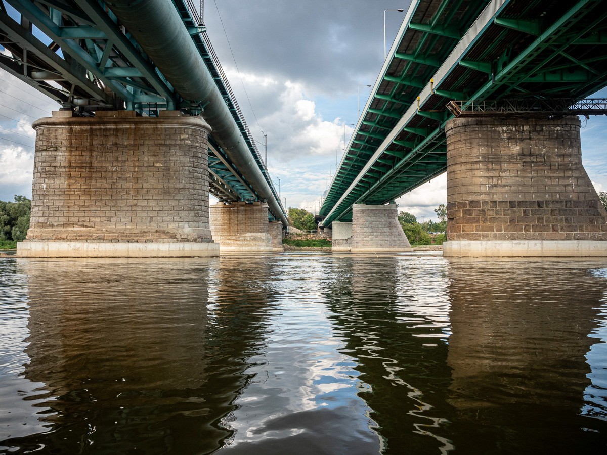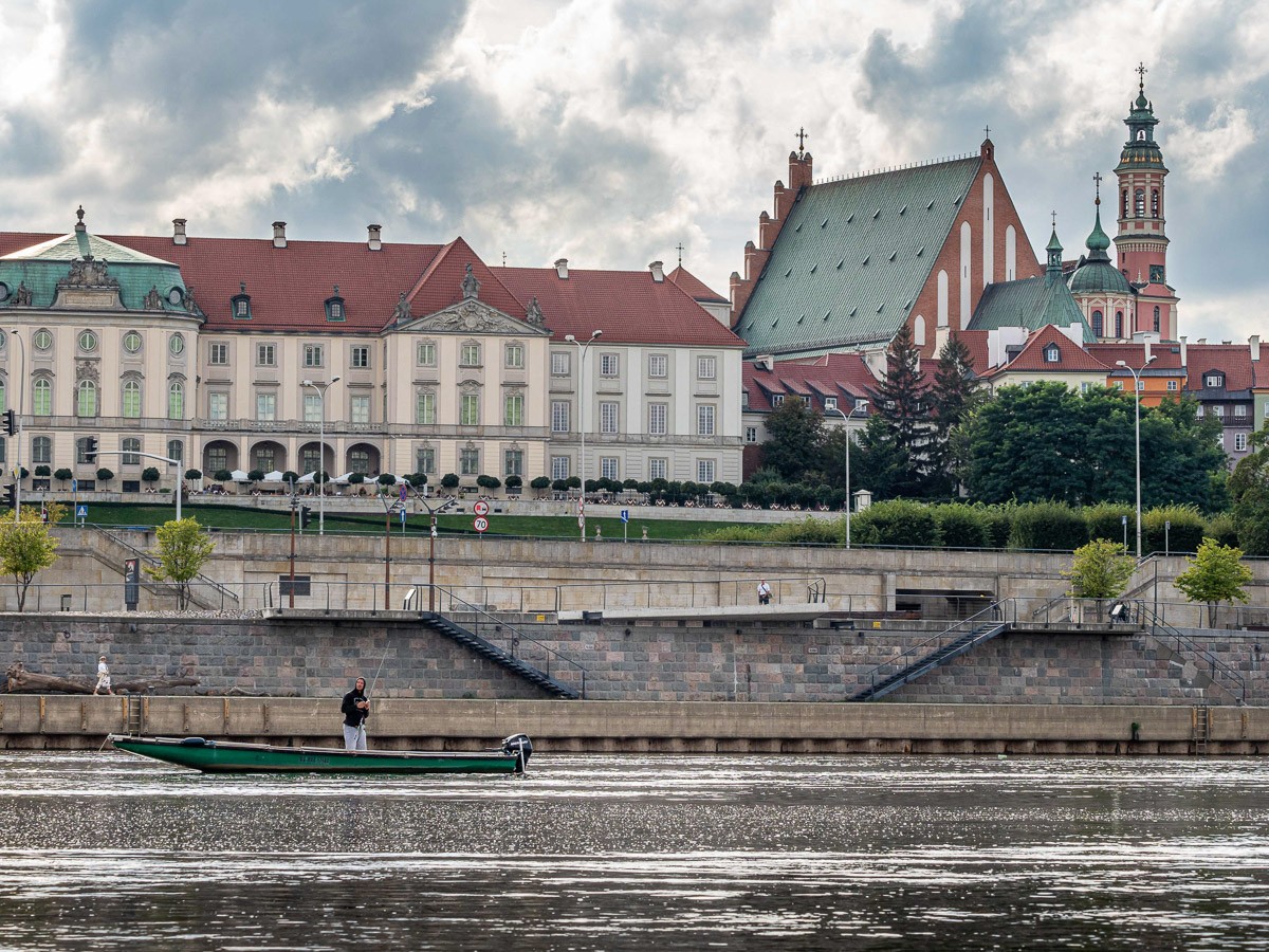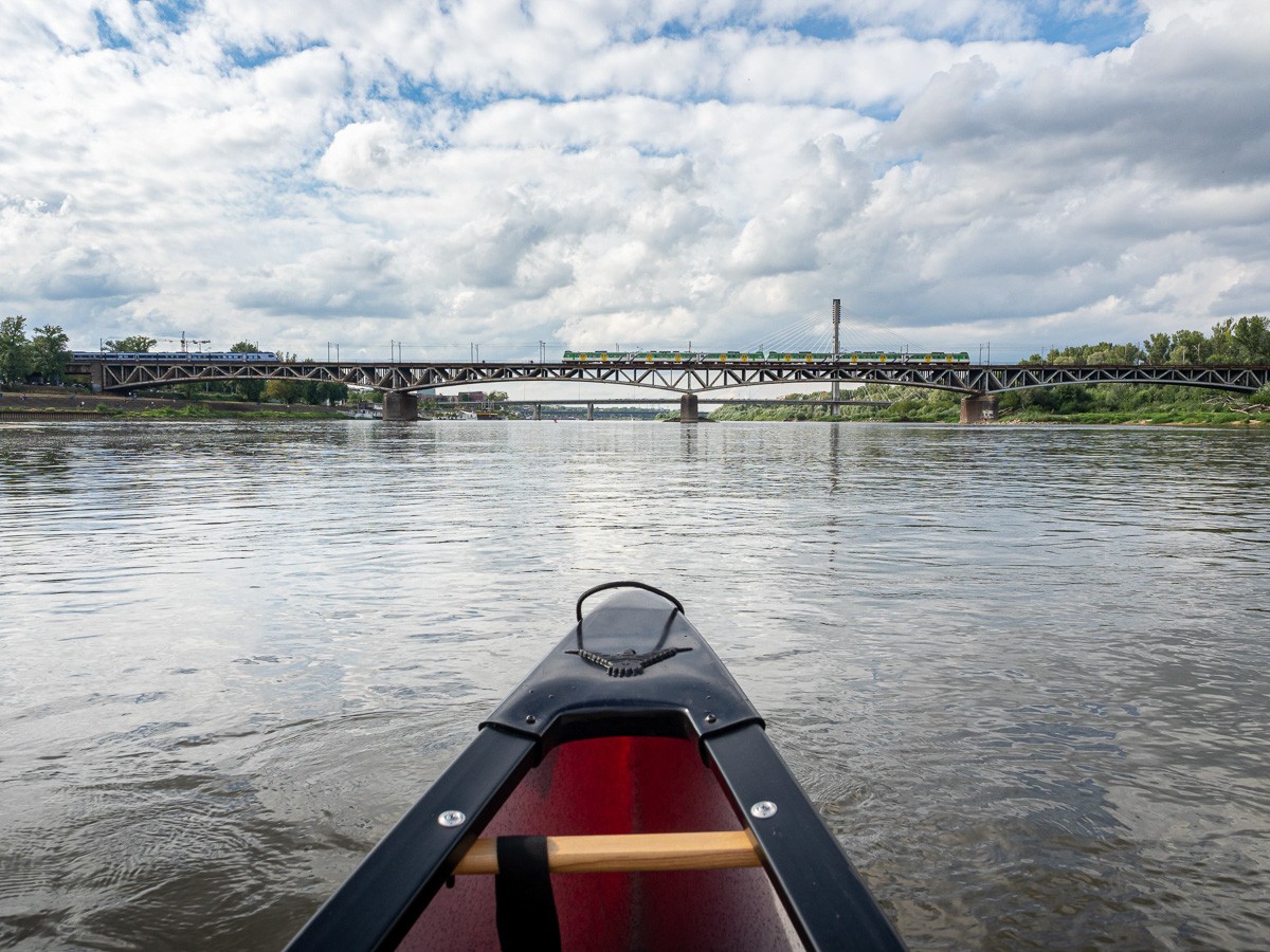 Ruszyliśmy z plaży na Saskiej Kępie, niedaleko Mostu Łazienkowskiego. Na początku czuliśmy się jak na jeziorze – Wisła gładka jak stół, płynęła sobie powoli. Nawet bez problemu dało się zawracać, żeby zrobić zdjęcia. Był stadion na prawym brzegu, różne rodzaje środków transortu publicznego sunące po kolejnych mostach, statki wycieczkowe, barki poprzerabiane na restauracje, pchające się na siebie kamieniczki na Starym Mieście i wznosząca się nad nimi katedra św. Jana Chrzciciela, mój ulubiony zielony Most Gdański z kręconymi schodami, za którym na horyzoncie pojawiła się elektrociepłownia Żerań. I wtedy Wisła zaczęła nas zaskakiwać. Zrobiło się jakby bardziej dziko, mewy i rybitwy krążyły nad wodą, a na coraz częściej wystających kamieniach przysiadały kormorany i czaple. W jednym miejscu poczuliśmy się jak na jakiejś górskiej rzece, gdy nurt przyspieszył i zaczęliśmy podskakiwać na falach. Za Kanałem Żerańskim znów zrobiło się leniwie, i tak już pozostało do mety – na Przystani Młociny.