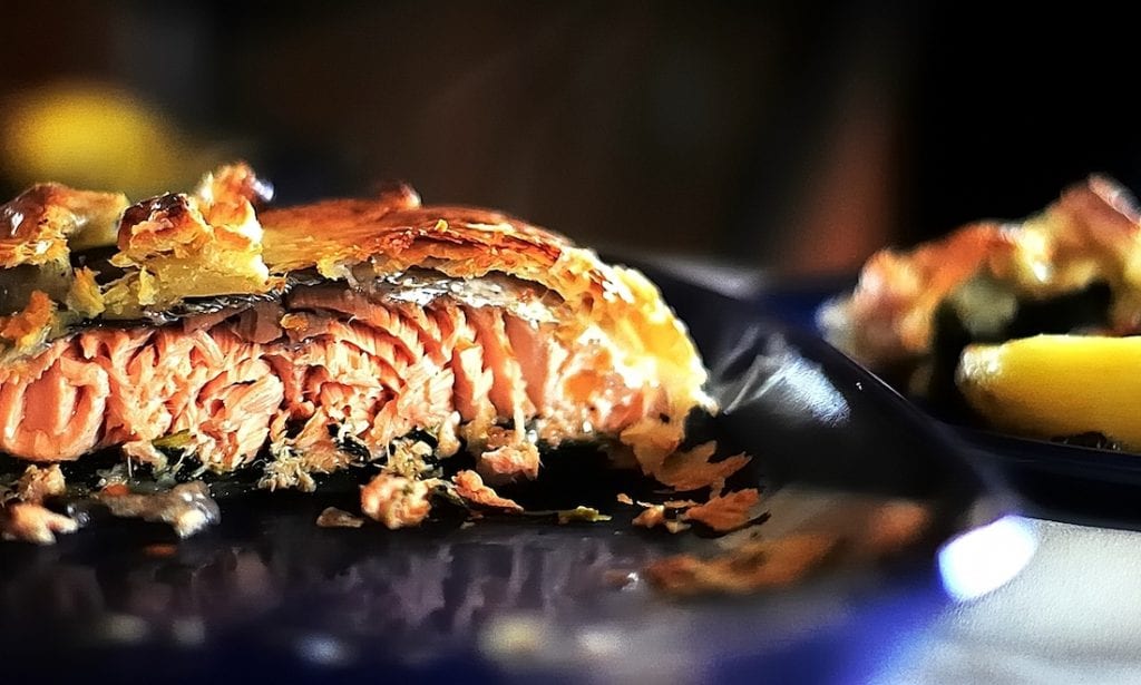 Zawijamy ciasto na szeroki wałek, przenosimy nad rybę i rozwijamy od jednego końca do drugiego. Ciasto ma objąć rybę w całości. Delikatnie dociskamy brzegi.