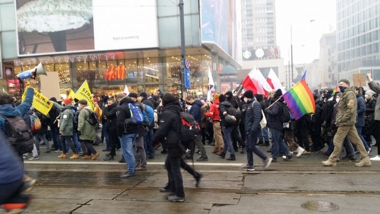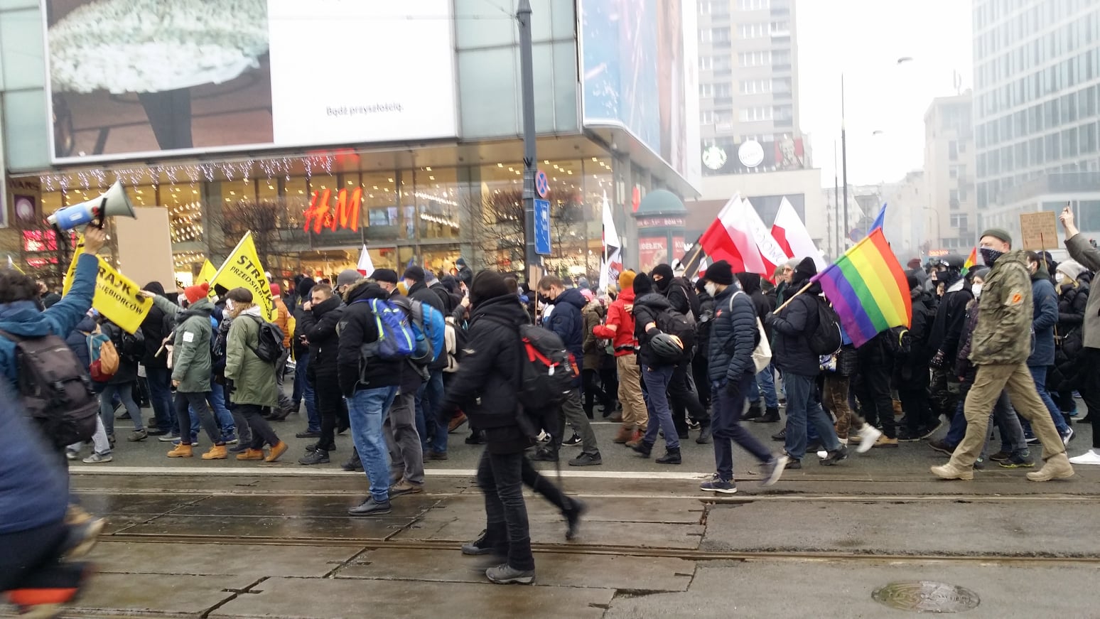 Marsz przeszedł przez stolicę pod tęczowymi i niebieskimi (UE) szmatami. Większość uczestników stanowili faceci – wielu wyglądała jak bojówkarze AntiFa. Widać było towarzyszy z Komunistycznej Partii Polski, z którymi w dziele obalania PiS, współpracuje na demonstracji Strajku Kobiet Strajk Przedsiębiorców. Można było dostrzec emerytów z Obywateli i antyfaszystowskich babć.