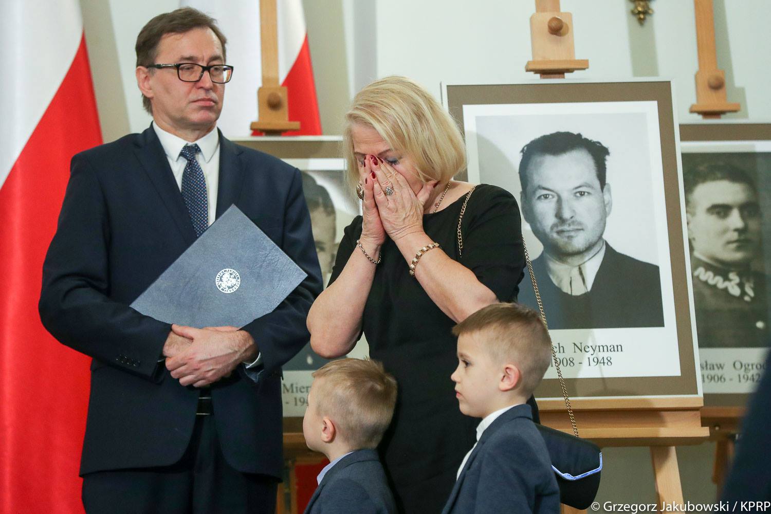 Na zdj. córka Stefanii Zarzyckiej, Magdalena, która urodziła się w 1949 r. w komunistycznym więzieniu. Jej matkę w ósmym miesiącu ciąży aresztowała bezpieka, oskarżając o wspieranie Polskiego Państwa Podziemnego. Kobieta urodziła córkę tuż po jednym z przesłuchań i chwilę potem zmarła. Dziewczynkę przez pierwsze dwa lata wychowywały inne więźniarki w lubelskim więzieniu, potem trafiła do domu dziecka. Przez lata nie znała miejsca pochówki matki, odnalazł je dopiero niedawno IPN. Dziś przyjechała do Pałacu Prezydenckiego po notę identyfikacyjną matki razem z własnymi wnukami.