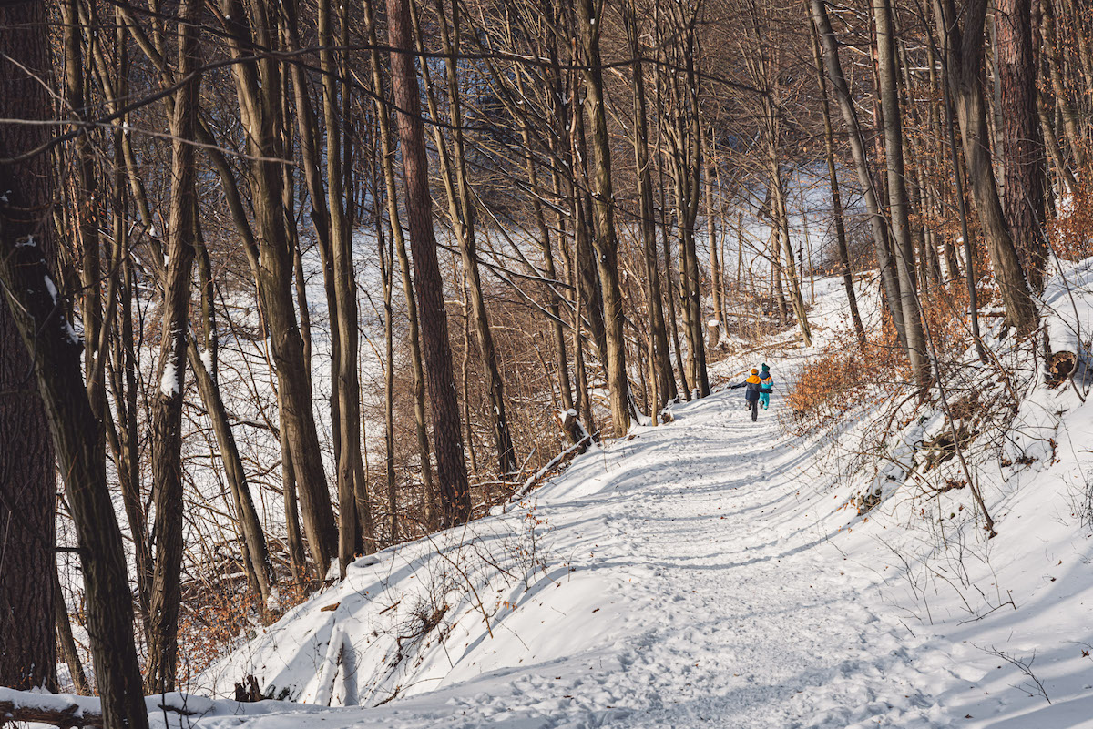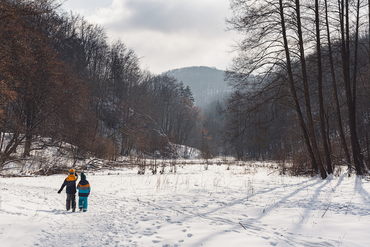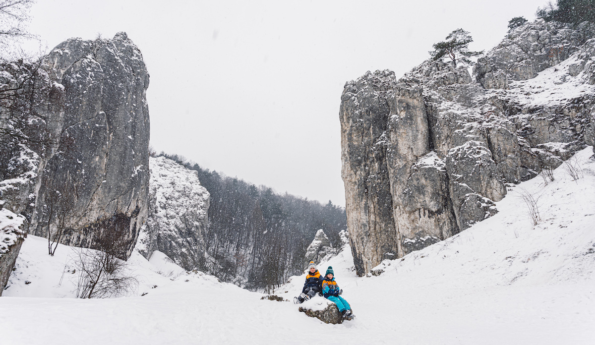 Następnie podjechaliśmy do Kobylan i rozpoczęliśmy wędrówkę malowniczą Doliną Kobylańską. Po obu stronach wznosiły się potężne skały. Ania i Jacek z pewną zazdrością patrzyli na dzieci, które wzięły ze sobą sanki. Nasze zostały w bagażniku. Dalej przeszliśmy do Doliny Bolechowickiej i na koniec wyszliśmy przez popularną Bramę Bolechowicką, którą tworzą dwie wapienne skały o wysokości 30 metrów – Filar Pokutników i Filar Abazego.