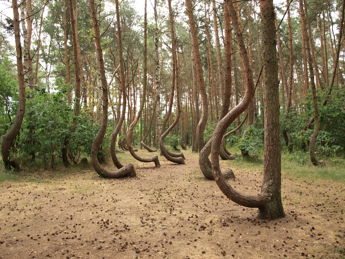 Krzywy Las, który odnaleźć możemy w pobliżu Gryfina (województwo zachodniopomorskie, Nadleśnictwo Gryfino) to niewątpliwie jedna z najsłynniejszych atrakcji przyrodniczych i turystycznych w Polsce. Od lat nie słabnie również jego popularność za granicami kraju, sprawiając, że miejsce to odwiedzają licznie goście z odległych niekiedy zakątków globu – Chin, Japonii, USA czy Kanady. W czym tkwi sekret tego niewielkiego leśnego zakątka? Niewątpliwie w nietypowo ukształtowanych pniach sosen zwyczajnych, które rosną na terenie Krzywego Lasu. Drzewa, nazywane często tańczącymi sosnami, posiadają charakterystycznie wykrzywione pnie, tworzące urokliwe i nadzwyczaj regularne łuki. Dzięki nim Krzywy Las nazywany jest często Lasem Magicznym, Księżycowym Gajem lub Kosmicznym Zakątkiem. Pomimo wielu prób ustalenia historii jego powstania dziś nadal posługujemy się wyłącznie hipotezami i domysłami. Z dużym prawdopodobieństwem uznać można, że wygięcia pni zostały zainicjowane ręką człowieka, który poprzez odpowiednie metody ich formowania osiągnął ten wyjątkowy kształt. Twórcom przyświecał z pewnością zamysł wykorzystania takich nietypowych drewnianych elementów do produkcji przedmiotów codziennego użytku. Jakich? Dziś trudno to wskazać. Być może były to elementy mebli, na które składają się fantazyjnie wyprofilowane łuki. A może takiego drewna używano do produkcji sań rogatych, popularnych w XIX wieku, których to, jak głosi wieść mała wytwórnia zlokalizowana była w tutejszych okolicach. Być może, jak głosi jedna z hipotez takie wyprofilowane, łukowane elementy mogły służyć do budowy beczkowatego kształtu wozów, którymi można było wozić duże ilości siana z pobliskiego Międzyodrza – obszaru położonego pomiędzy dwoma ramionami Odry. Przed II wojną i tuż po jej zakończeniu Międzyodrze wykorzystywane było rolniczo jako rozległe pastwiska i łąki kośne. Wśród gości odwiedzających ten niezwykły las są również i tacy, którzy w tych nietypowych drzewach upatrują działania sił kosmicznych, istnienia w tym miejscu tajemniczego miejsca mocy, czy podziemnych cieków wodnych, które mogą wpływać na powstawanie takich osobliwych deformacji. Bez względu na liczne hipotezy jedno jest pewne – miejsce to przyciąga jak magnes.