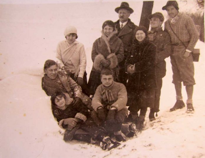 Za nimi, od lewej: Jan Anyszek, Krystyna Kramarska-Anyszek (autorka Książki Babci), Zofia Kramarska (żona Mariana), Józef Wilczyński, Maria Sawicka, Marian Kramarski, xxx.