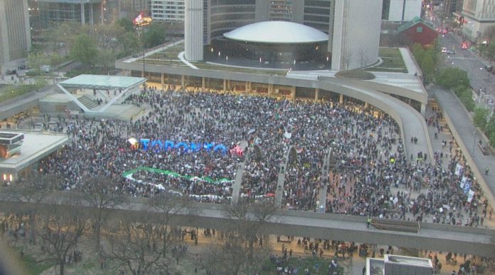 Palestyńskie flagi i transparenty z napisem „Wolna Palestyna” wypełniały w sobotę wieczorem szczelnie plac Nathan Phillips, gdzie tysiące ludzi protestowały wyrażając poparcie dla mieszkańców Gazy.