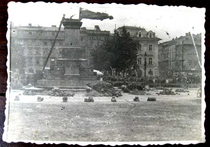 Żołnierze niemieccy niszczą pomnik Adama Mickiewicza na Rynku Głównym w Krakowie. Sierpień 1940 r. Zdjęcie ze zbiorów Krystyny Kramarskiej-Anyszek, autorki Książki Babci. Kraków August 1940. The German Nazis destroy the monument of Adam Mickiewicz, Polish poet, in the Main Market of Kraków after invading Poland in September 1939.