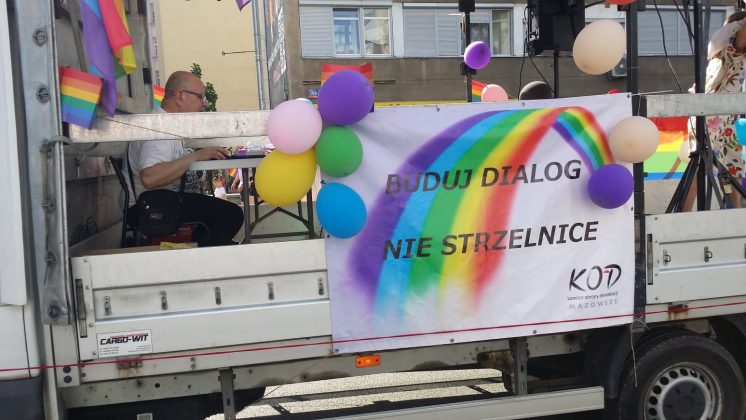 Widziałem dosłownie jednego przeciwnika PiS z antyPiS tabliczką, dwie flagi Obywateli RP, samochód dostawczy z flagą i transparentem KOD (transparent sprzeciwiał się budowie strzelnic), kilka flag antyPiSowskich Polskich Babć (miały ze sobą jedną flagę Strajku Klimatycznego), które tak się nudzą, że pojawiają się wszędzie, ciężarówkę mająca reprezentować gejów z Białorusi, na której starsze aktywistki machały flagą Strajku Kobiet.