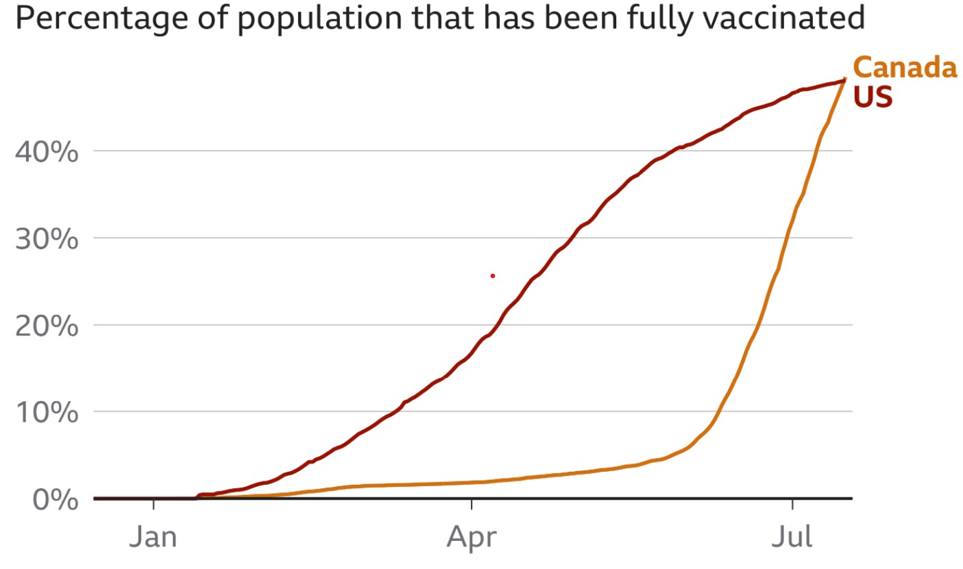Od 16 lipca 48,45% Kanadyjczyków jest w pełni zaszczepionych przeciwko Covid-19, w porównaniu z 48,05% Amerykanów.