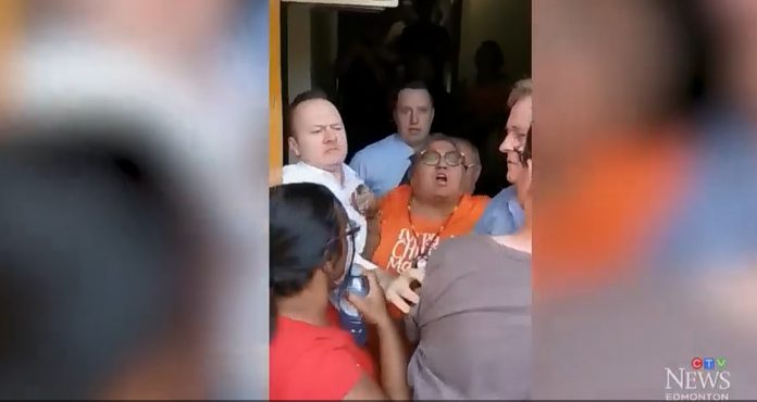 Protestujący przed kościołem katolickim w Edmonton usiłowali wejść do świątyni podczas niedzielnej mszy, ale zostali zablokowani przez wiernych parafii Matki Bożej Królowej Polski i wypchnięci.