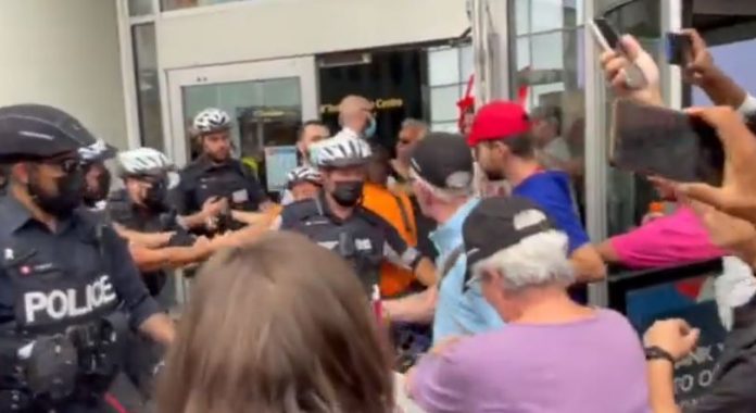 Shortly after Chris Sky incited the crowd to “go do something” (such as storm restaurants or the mall), unmasked people from the audience tried forcing their way into @CadFairview Eaton Centre. @blogTO @nowtoronto #cdnpoli #antivaxxers #JustSayNo pic.twitter.com/ZJWmPEleUY