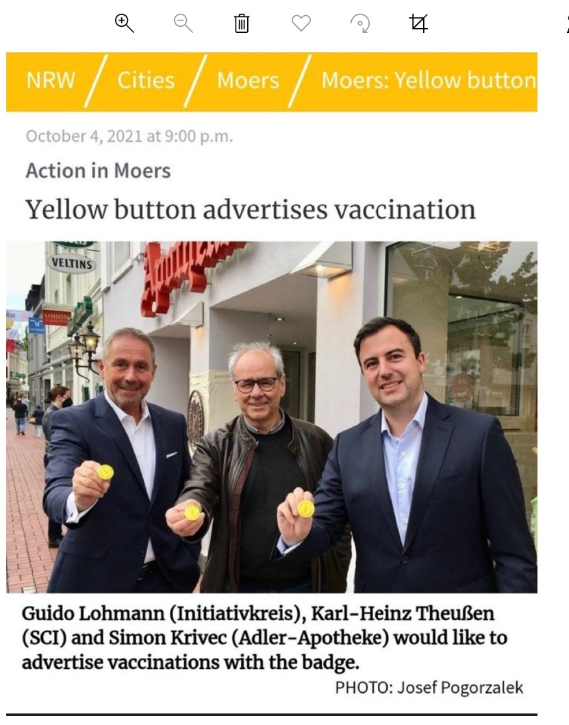 W Niemczech wprowadzono żółte plakietki identyfikujące zaszczepionych. „Zostałem zaszczepiony”. W środku: wizerunek strzykawki w kolorze sygnałowej czerwieni. T