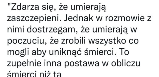 “Doradca Naczelnej Rady Lekarskiej ds. COVID-19 Dr Paweł Grzesiowski stwierdził w wywiadzie dla jednego z publikatorów: Zdarza się, że umierają zaszczepieni. Jednak w rozmowie z nimi dostrzegam, że umierają w poczuciu, że zrobili wszystko co mogli aby uniknąć śmierci. To zupełnie inna postawa w obliczu śmierci niż ta antyszczepionkowców