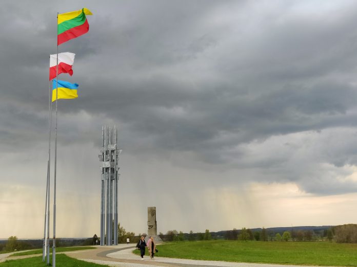 Odwiedziliśmy dzisiaj pole bitwy pod Grunwaldem. Ku naszemu zdumieniu na masztach przy pomniku Zwycięstwa Grunwaldzkiego wisiały flagi Polski, Litwy i… Ukrainy. Flaga Ukrainy po prawej stronie, widoczna z drogi jako pierwsza.