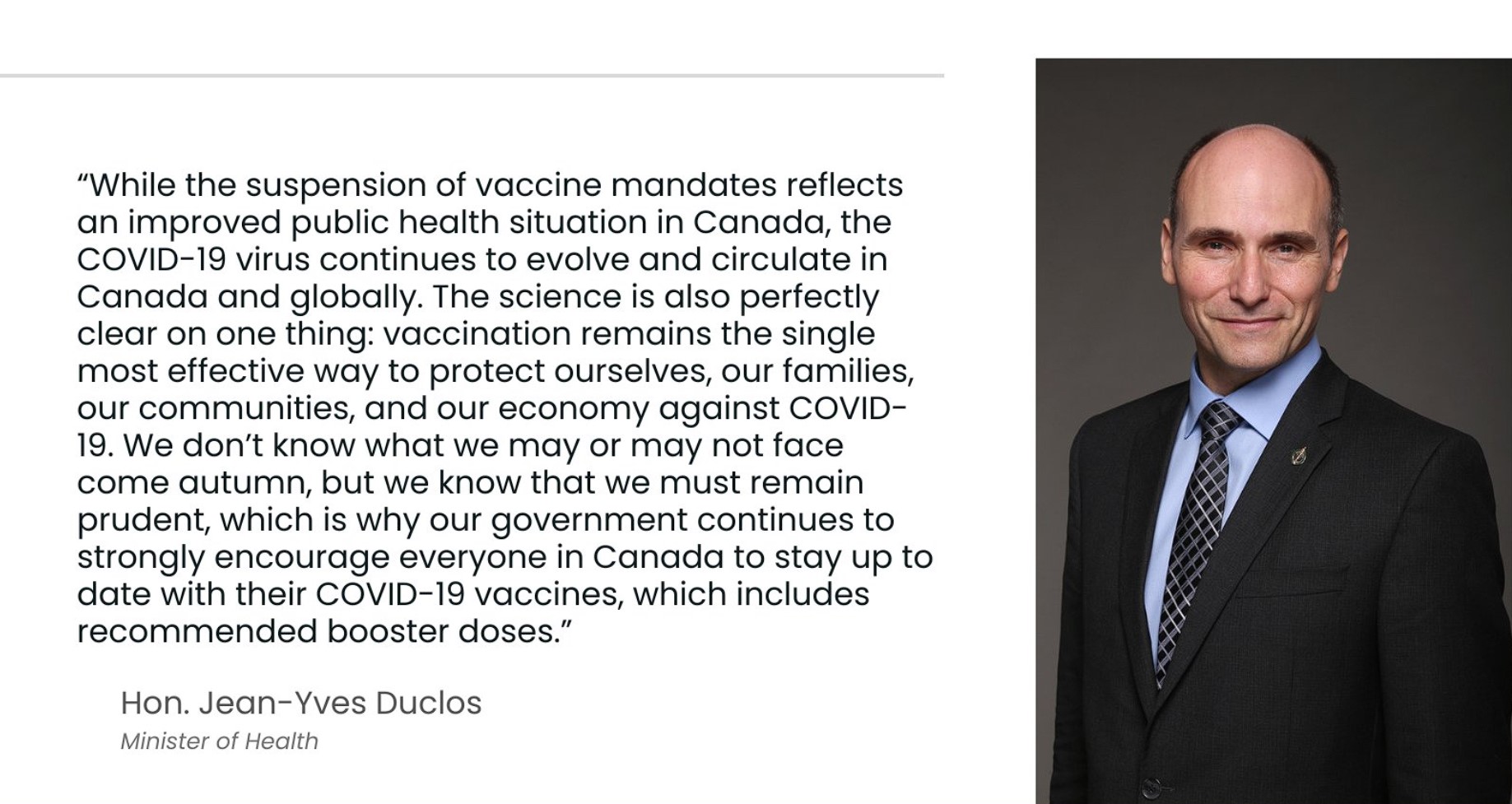 Według Duclos, który wcześniej sugerował, że zastrzyki przeciwko COVID powinny być obowiązkowe , „wskaźnik dawek przypominających w Kanadzie jest zbyt niski, niższy niż w jakimkolwiek innym kraju G7”, i rząd planuje go poprawić w „nadchodzących tygodniach i miesiącach”.