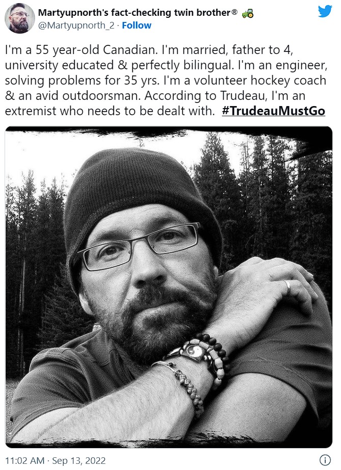 „Jestem 55-letnim Kanadyjczykiem. Jestem żonaty mam wykształcenie uniwersyteckie i władam obydwoma (urzędowymi) językami. Jestem inżynierem od 35 lat. Jestem wolontariuszem trenerem hokeja i zapalonym sportowcem. Według Trudeau jestem ekstremistą, z którym trzeba coś zrobić” – napisał w tweetcie Bélanger .