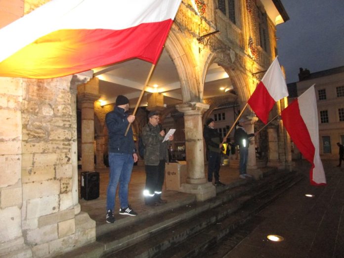 Spotkaliśmy się na Rynku Głównym (Cathedral Square) w Peterborough. Pieśni: Bogurodzica, Święty Boże, Pieśń Konfederatów Barskich, Rota. Po przemówieniach przemarsz przez miasto do Zatopionych Ogrodów (Sunken Gardens). Tam zapaliliśmy znicze i złożyliśmy kwiaty na pomniku Lotników, skandowane były hasła: Cześć I Chwała Bohaterom – Bóg Honor i Ojczyzna – Nie laicka nie tęczowa, ale Polska Narodowa – A na drzewach zamiast liści będą wisieć komuniści, i cztery zwrotki Hymnu Narodowego w blasku rac.