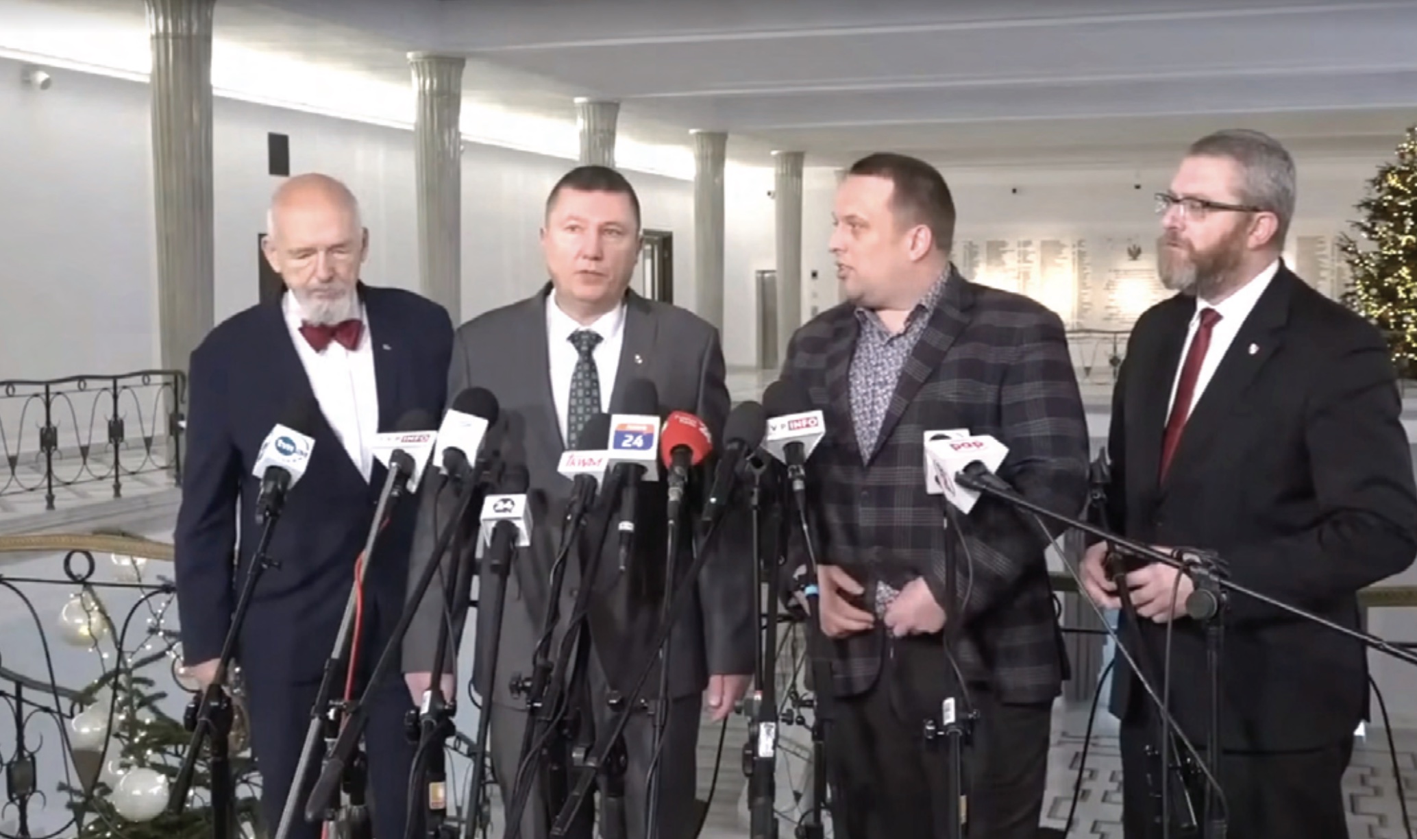 Prowadzący: Witamy Państwa na konferencji prasowej dotyczącej szokującej informacji, którą zdobył stojący obok mnie pan redaktor Leszek Szymowski o tym, że premier naszego państwa Mateusz Morawiecki był w swoim czasie dwukrotnie zarejestrowany jako odpowiednik naszego tajnego współpracownika w służbie wschodnio-niemieckiej. Ze mną pan poseł i pan prezes Janusz Korwin-Mikke, pan poseł Grzegorz Braun. I proszę właśnie pana posła Korwin-Mikke o zabranie głosu.
