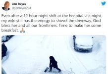 Żona z łopatą odgarnia śnieg po 12-godzinnej zmianie w szpitalu