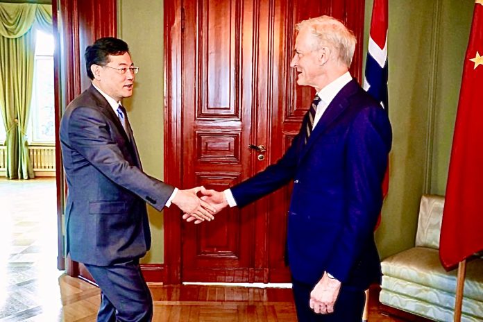 W piątek 12. maja 2023 Qin przeprowadził rozmowy z ministrem spraw zagranicznych Annikenem Huitfeldtem i spotkał się z premierem Jonasem Gahrem Støre.