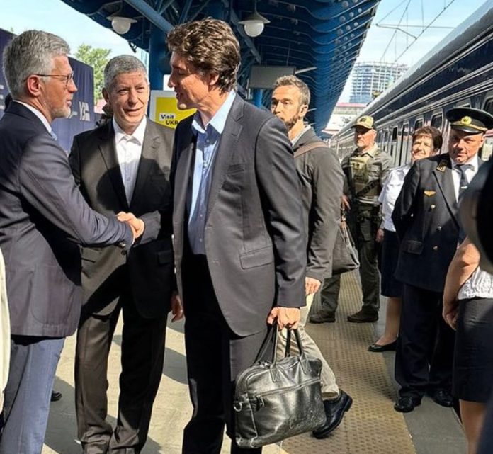 „Witamy na Ukrainie, panie premierze” – czytamy w anglojęzycznym tweecie Melnyka obok zdjęcia, na którym ściska  dłoń Trudeau. Melnyk był w składzie delegacji, która powitała Trudeau na dworcu kolejowym w Kijowie i towarzyszyła mu w wycieczce po mieście.