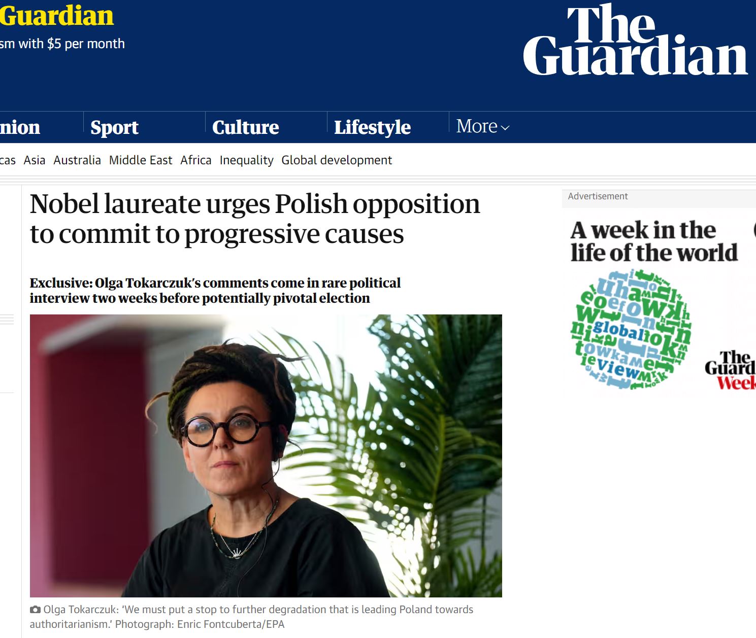 Wywiad z Olgą Tokarczuk czołówką “The Guardian”. Pisarka ma nadzieję na zmianę władzy w Polsce