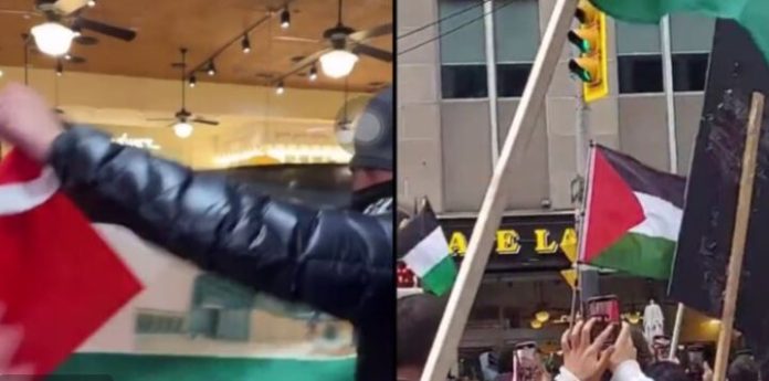 Materiał udostępniony w mediach społecznościowych pokazuje grupę propalestyńskich protestujących zebranych przed restauracją w Toronto, a niektórzy członkowie tłumu nazywają ją „kawiarnią syjonistyczną” i wzywają do bojkotu.