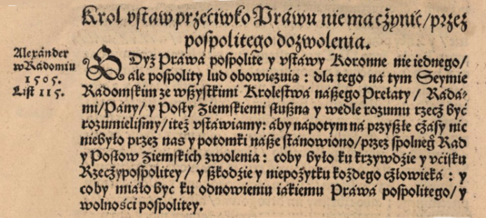 Rok 1505 został zapamiętany w historii Polski jako rok zwycięstwa ruchu obywatelskiego (Ruchu Egzekucji Praw i Dóbr) nad samowolą władzy. Ale nie tylko. Nastąpił niewyobrażalny wcześniej rozwój naszej Ojczyzny. Wolność obywatelska szybko zaowocowała dobrobytem państwa.