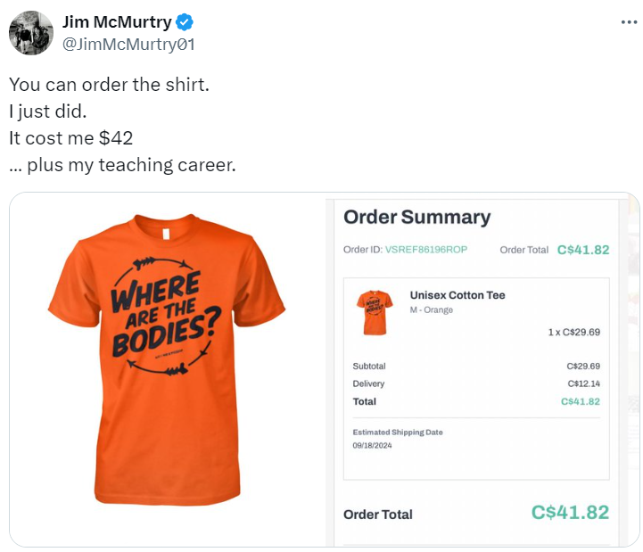 Jim McMurtry, były nauczyciel w Abbotsford School District (ASD), który został zwolniony za kwestionowanie narracji o rzekomych nieoznakowanych grobach w Kamloops Indian Residential School, zachęcał ludzi do zamawiania pomarańczowych koszulek z pytaniem na ich temat.