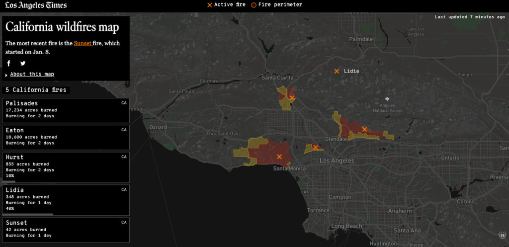 Już czwarty dzień strażacy walczą z sześcioma oddalonymi od siebie pożarami w powiecie Los Angeles. Dwa największe to Palisades (20,000 akrów, pożar opanowany tylko w 6%) i Eaton (14,000 akrów, opanowany w 3%), ucichły silne wiatry Świętej Anny, ale mają powrócić w weekend. Do tej pory szalejący pożar strawił ponad 10,000 domów i biznesów. Ewakuowano 180,000 ludzi, ale to pewnie nie koniec. Okazało się, że strażacki rezerwuar wodny w Pacific Palisades był pusty, kiedy strażacy uruchomili hydranty nie płynęła woda, tylko rozczarowanie i przerażenie. Administracja mer Bass obcięła strażakom budżet z $837 mln na $819 mln, jednocześnie odbierając im część sprzętu i wysyłając … Ukrainie. Dotąd spłonął obszar trzy razy większy od Manhattanu, przeciętna cena domu w dzielnicy Pacific Palisades wynosi $3 mln…