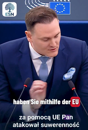 „Panie Tusk, pan chyba lepiej rozumie po niemiecku, więc zrobię panu tą przyjemność !”- zwrócił się niemiecki Polityk do Donalda Tuska piękną polszczyzną, następnie przeszedł, patrząc na polskiego premiera – na język niemiecki. „ Politycy tacy jak pan, są największym zagrożeniem dla narodów Europy! Kiedy był pan w opozycji, atakował pan za pomocą UE suwerenność własnego kraju, teraz gdy znów pan rządzi – niszczy pan praworządność w Polsce; opozycja jest ścigana politycznie, niewygodne wyroki sądowe są unieważniane, wasz zamach na media był nielegalny, a teraz grozi pan jeszcze większą cenzurą w Internecie, To coraz bardziej przypomina reżim! Czegoś takiego nie było wcześniej. To, czego dokonaliście w jednym roku w kwestii łamania praworządności – PiS nie odważył się w ciągu 8 lat. Unia Europejska pozwala Panu na to, w końcu pan był najwierniejszym sługą Brukseli. A teraz może pan zniszczy całą Europę; masowa migracja, cenzura, eskalacja geopolityczna, wokizm zielony ład – jest pan przecież prekursorem tego wszystkiego, nawet jeśli dziś nie chce tego pan już pamiętać. Jest pan polską Angelą Merkel, polską Ursulą von der Leyen”
