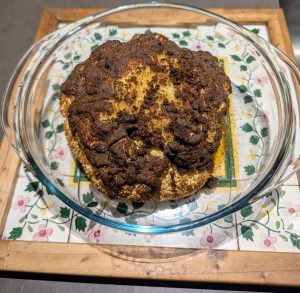 Posmarować połową przypraw górę kalafiora, drugą połową spód; piec w 425 F/ 220 C przez 30 minut głąbem do góry, odwrócić i piec następne 30 minut do miękkości i brązowego koloru. Podawać z sosem z tahini sporządzonym z ½ kubka pasty sezamowej, 3 łyżek soku z cytryny, 1 łyżki syropu klonowego, 1 łyżki oliwy, 1 ząbka czosnku oraz 2-5 łyżek wody.
