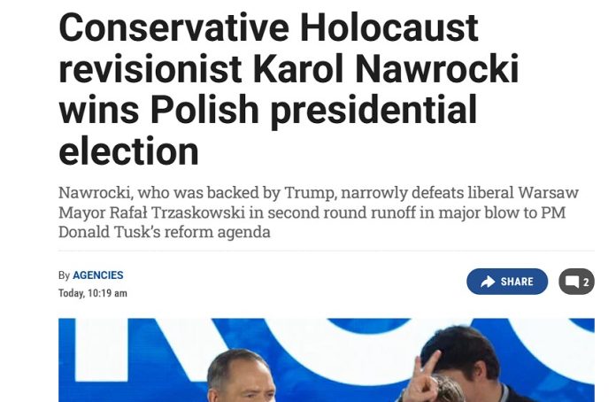 Konserwatysta Karol Nawrocki, który uczynił rewizjonizm holokaustu częścią swojej kampanii, wygrał weekendowe wybory prezydenckie w Polsce – czytamy na łamach izraelskiego dziennika. – Wynik wskazuje na to, że można się spodziewać, iż Polska pod rządami nowego przywódcy, popartego przez prezydenta USA Donalda Trumpa, podąży bardziej populistyczną i nacjonalistyczną ścieżką.