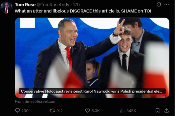 Kandydat na ambasadora USA w Warszawie Tom Rose skrytykował artykuł “Times of Israel” na temat Prezydenta – Elekta dr. Karola Nawrockiego “Konserwatywny rewizjonista Holokaustu Karol Nawrocki wygrywa wybory prezydenckie w Polsce”. “Cóż za całkowita i oszczercza HAŃBA w tym artykule. WSTYD dla TOI” – napisał.