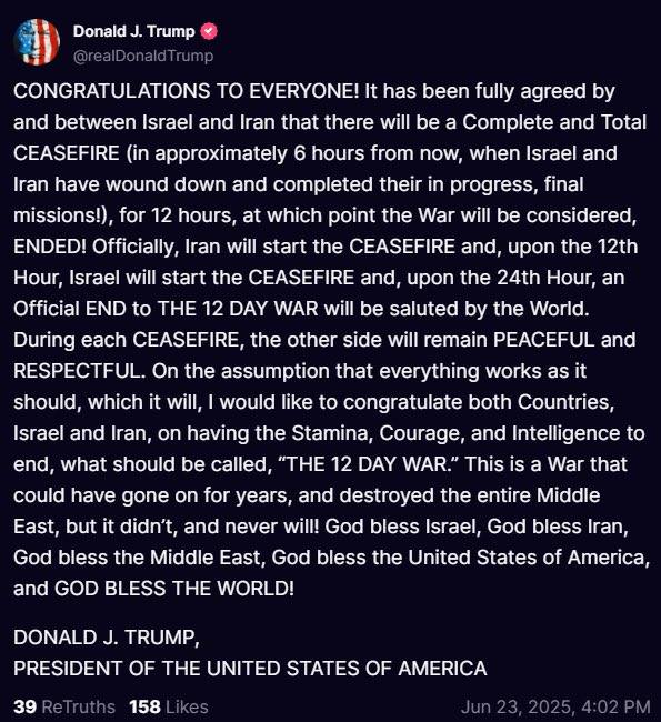 „Izrael i Iran w pełni uzgodniły, że nastąpi całkowite i całkowite zawieszenie broni… na 12 godzin, po czym wojna zostanie uznana za ZAKOŃCZONĄ!” Trump napisał w poście na Truth Social.