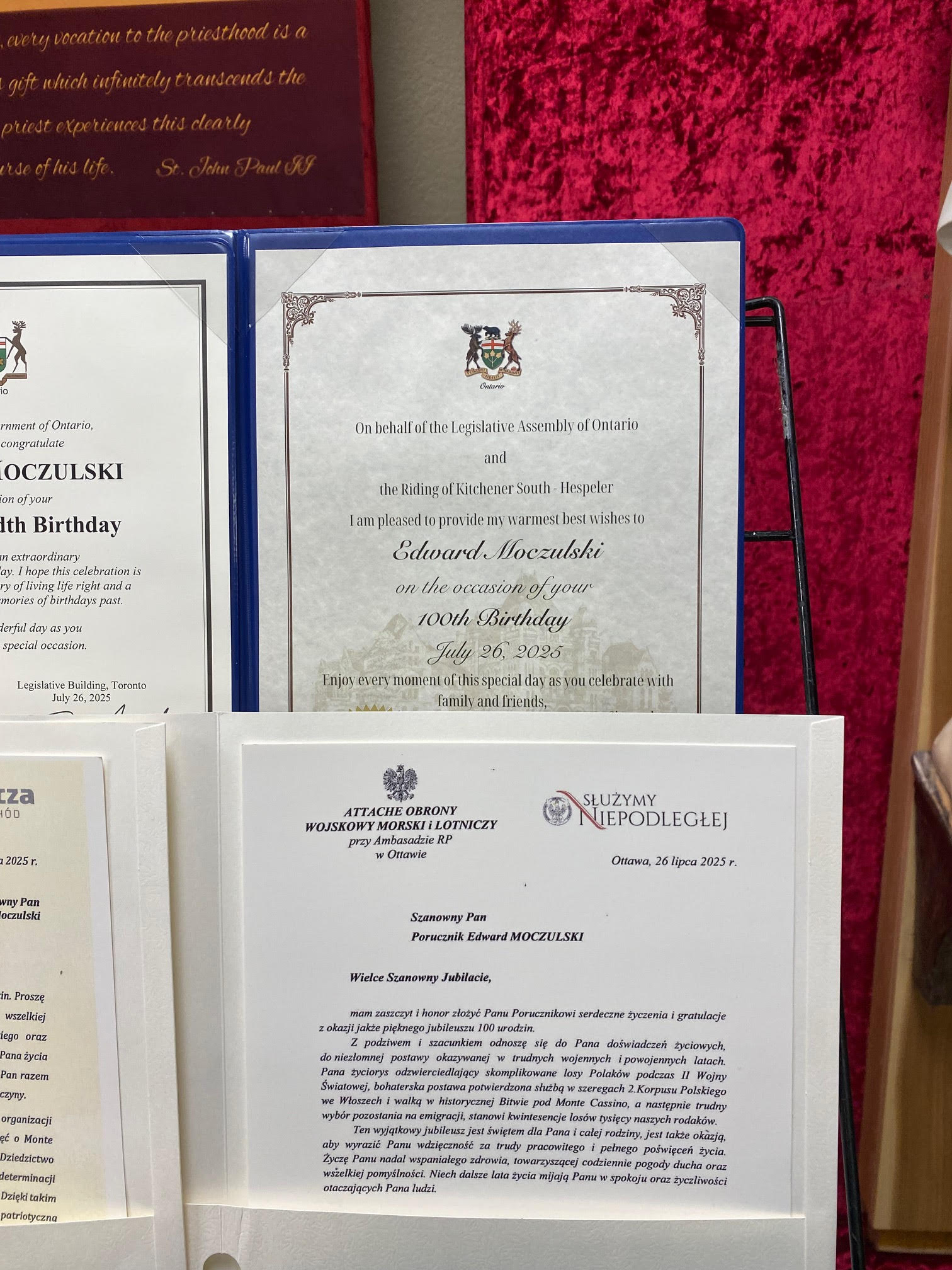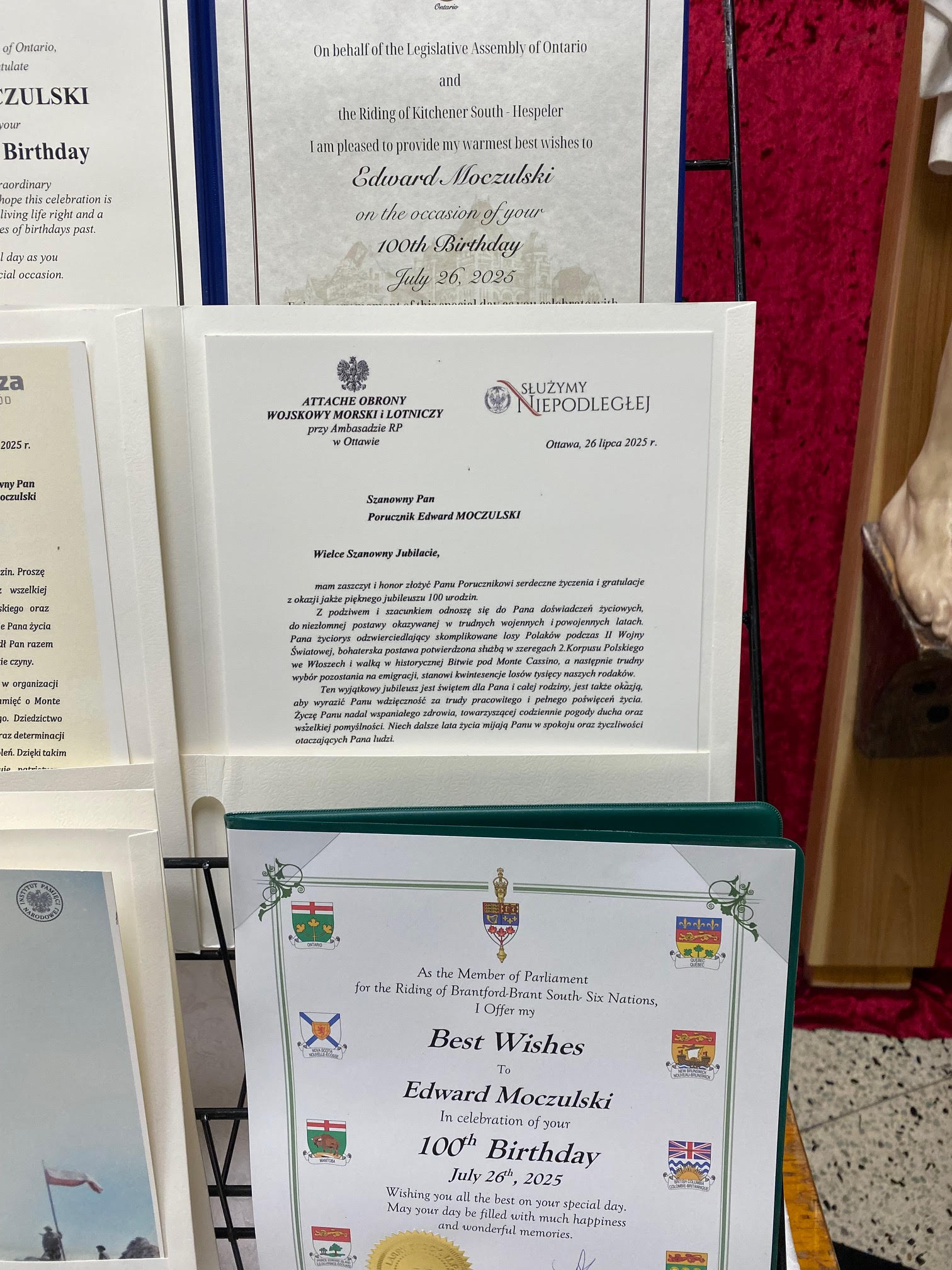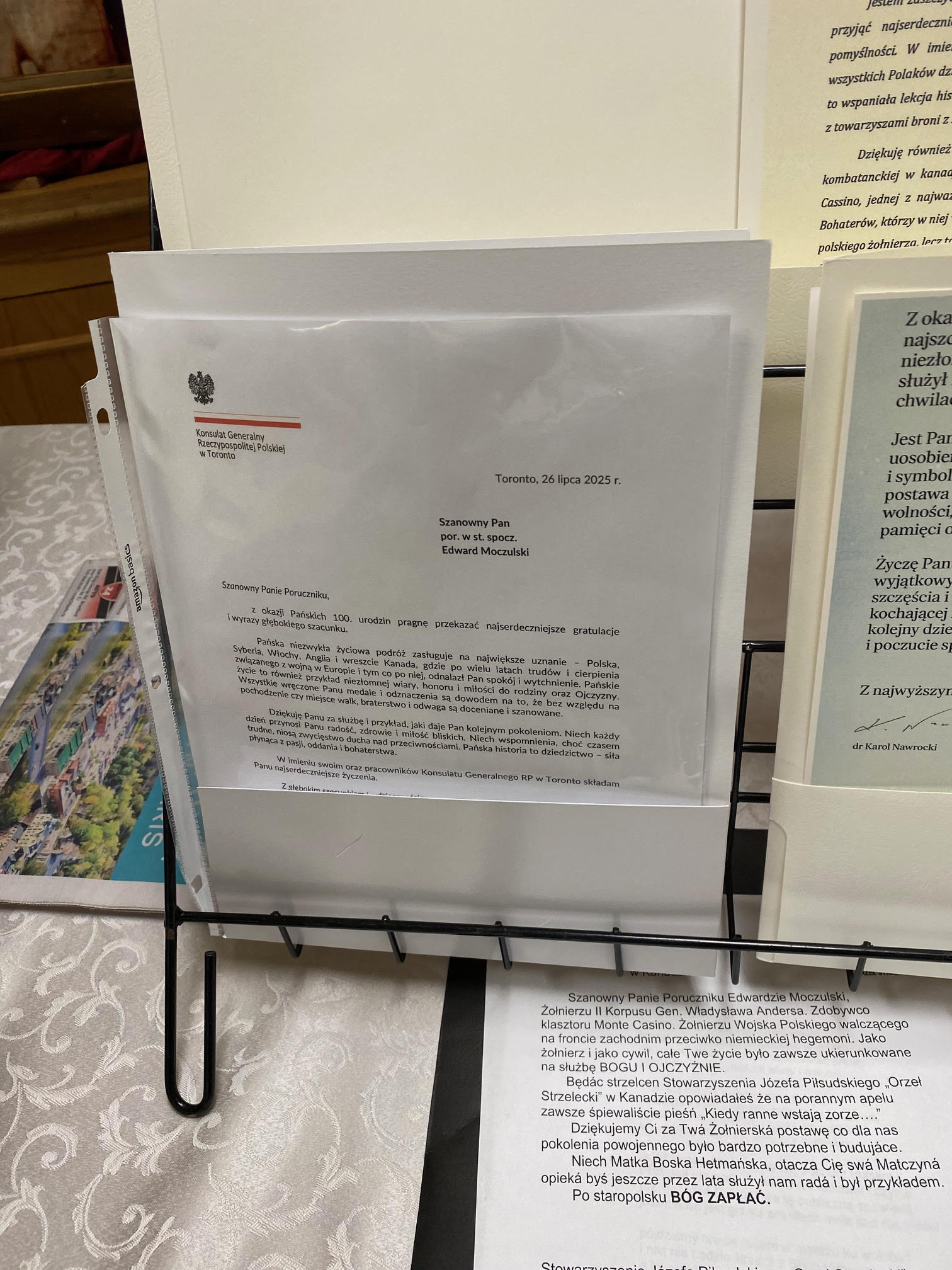 Pan Porucznik 27 lipca w Kitchener w Kościele p/w Przenajświętszego Serca Pana Jezusa. Jubilat otrzymał podziękowania za niezłomną postawę patriotyczną i katolicką. Podziękowania i dyplomy Pan otrzymał od Papieża Leona XIV, SPK, KPK, ZPwK, ZNP, harcerzy, SJP “Orzeł Strzelecki “ w Kanadzie i osób prywatnych. To było bardzo duchowe spotkanie z żywą historią.